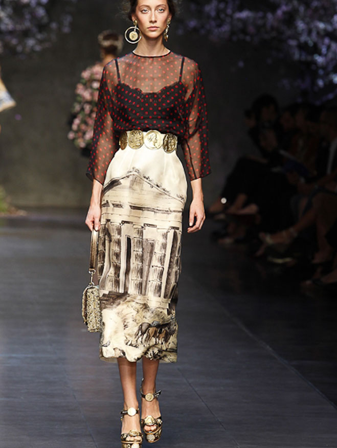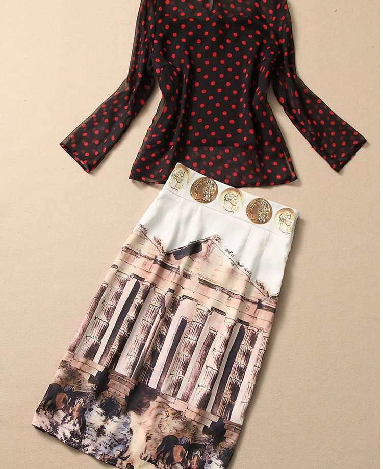 RED BLACK DOT CASTLE PRINTED LONG SLEEVED SHIRT SKIRT SUIT DRESS