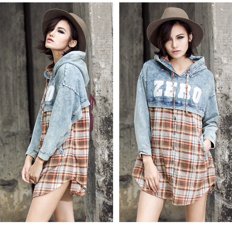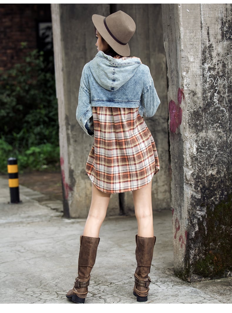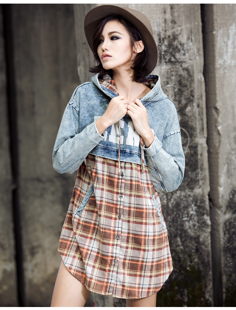 EUROPEAN STYLE LOOSE DENIM HOODED PLAID DRESS SHIRT