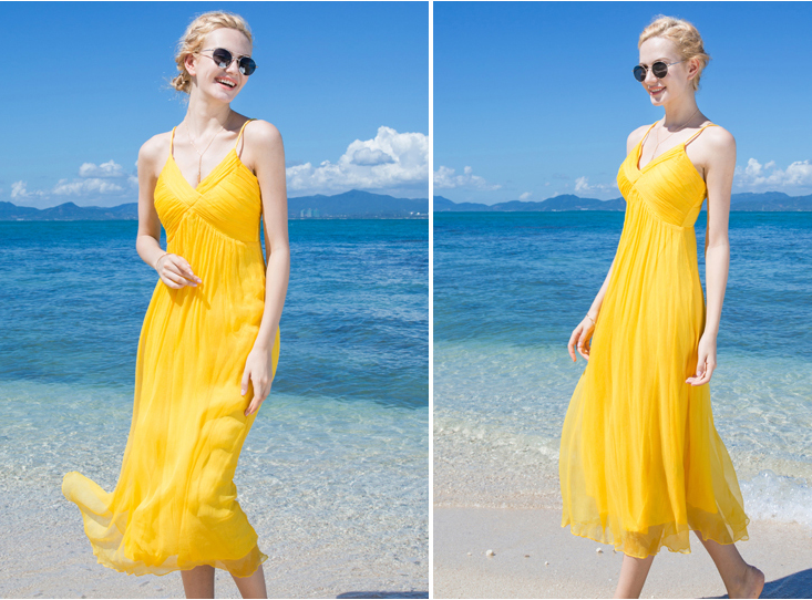 BOHEMIAN STYLE YELLOW SUMMER SILK DRESS 70015310915