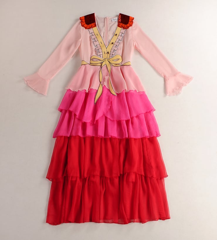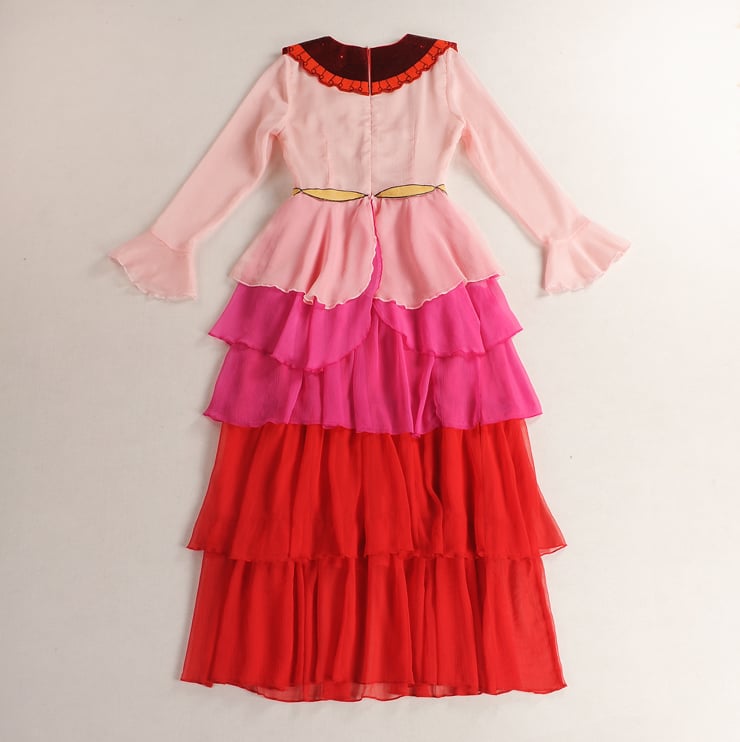 V NECK SPRING COLLECTION EMBROIDERED PINK RED FLOUNCED TRIO COLOR LONG DRESS