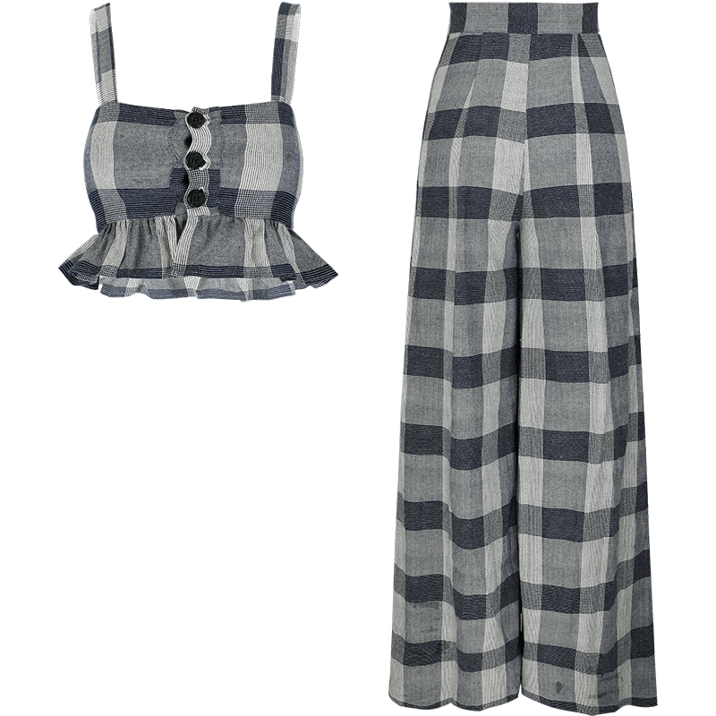 SINCE THEN VINTAGE INSPIRED BUTTON THROUGH CROP TOP AND WIDE LEG TROUSERS IN CHECK