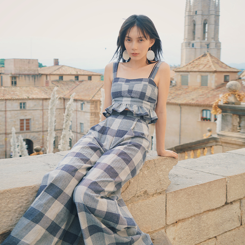 Check print Button through crop top Wide leg trousers 85% organic cotton