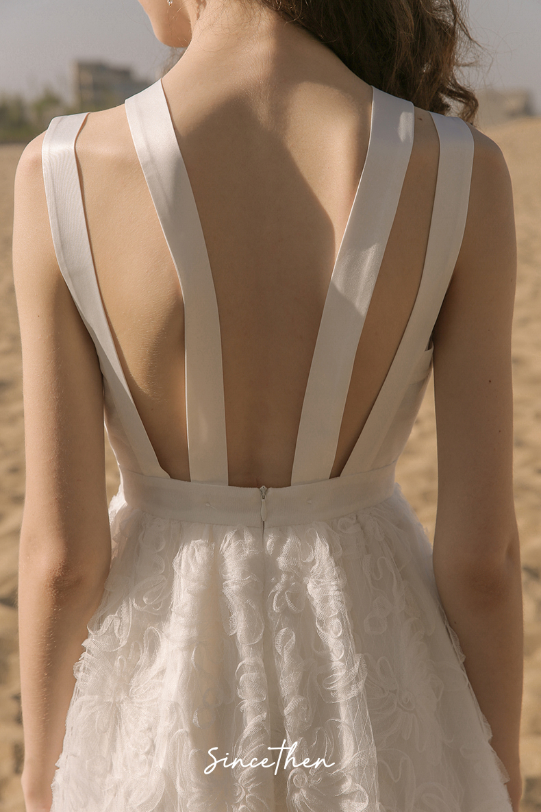 Mini-length lining Cut out front detail Fitted waist Full skirt Zip fastening Embroidered design