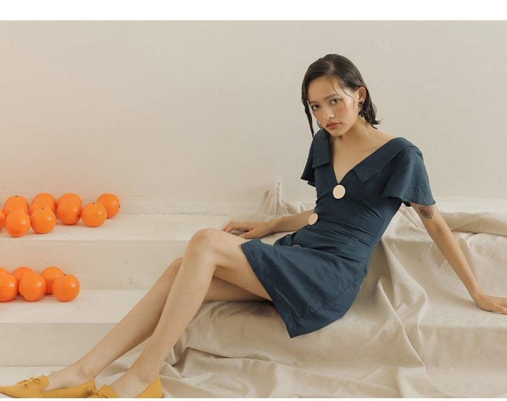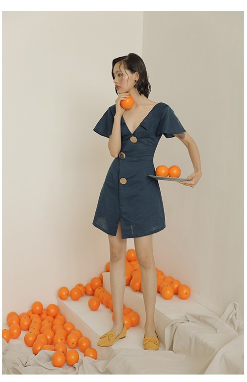SINCE THEN ASYMMETRIC BUTTON THROUGH MINI DRESS IN DARK BLUE