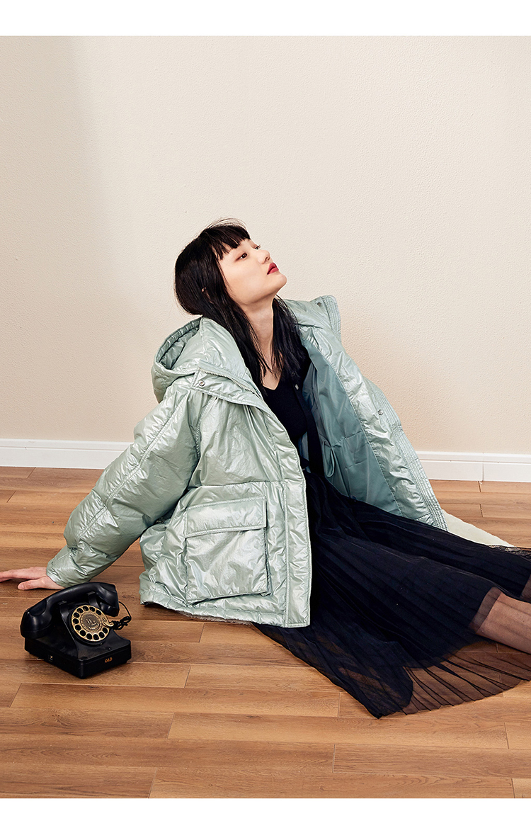 PEACE BIRD HOODED PUFFER JACKET IN LIGHT GREEN