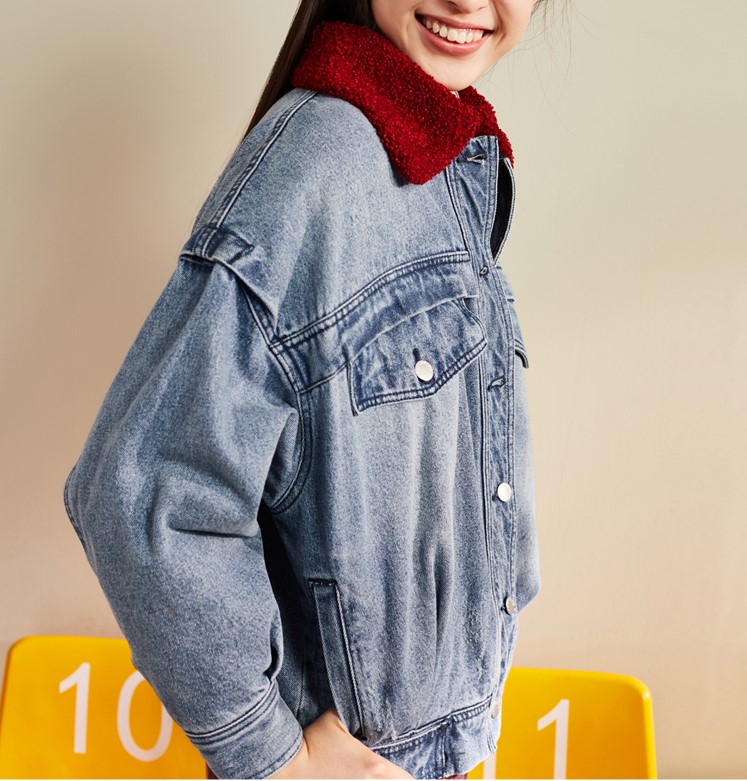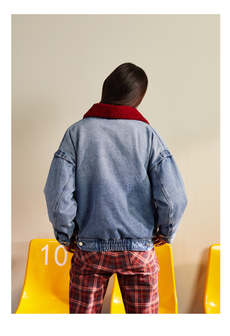 Contrast borg collar Button placket Functional pockets Non-stretch denim Thick, rigid fabric Regular fit