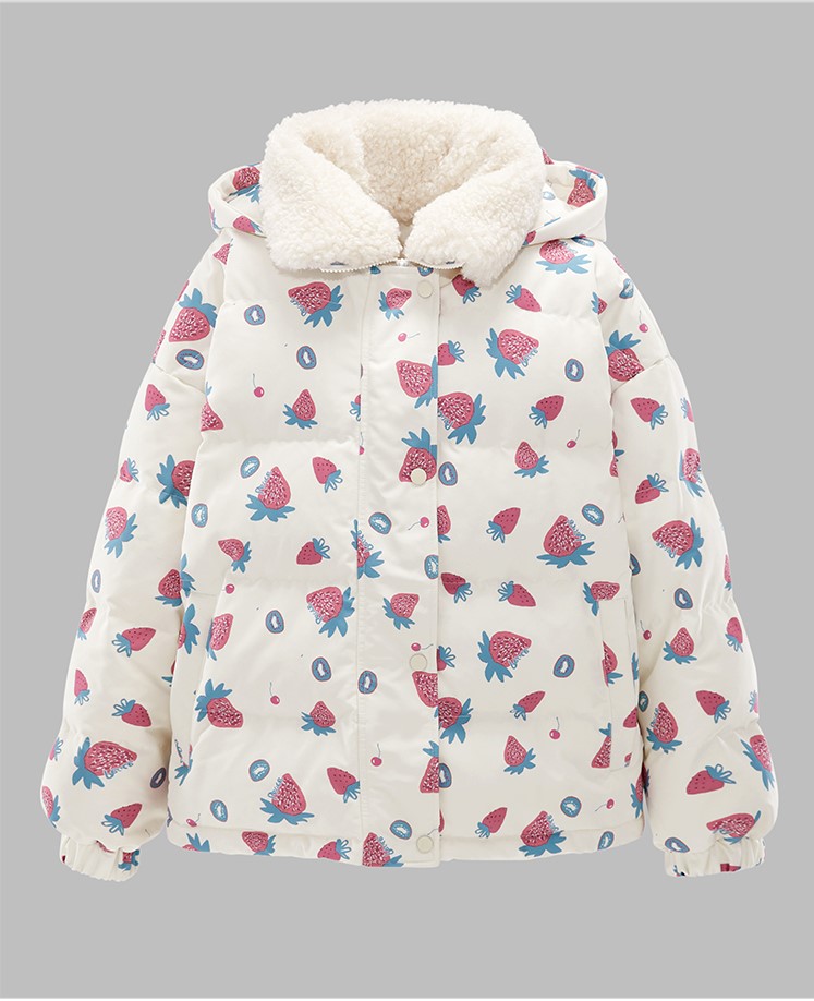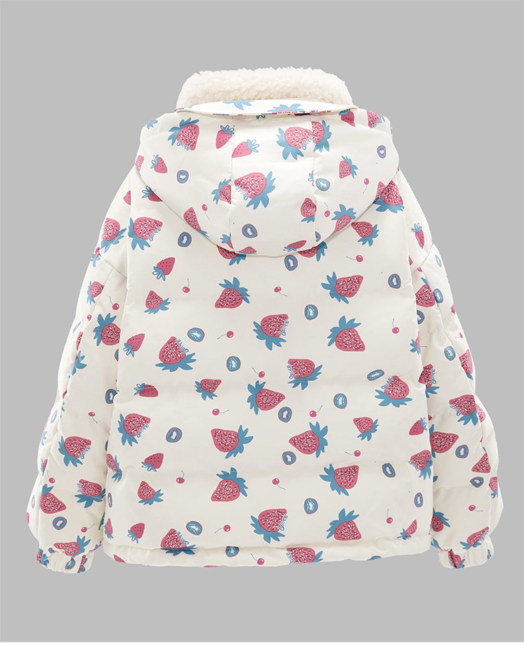 PEACE BIRD STRAWBERRY PRINT PUFFER JACKET WITH BORG LINED DESIGN