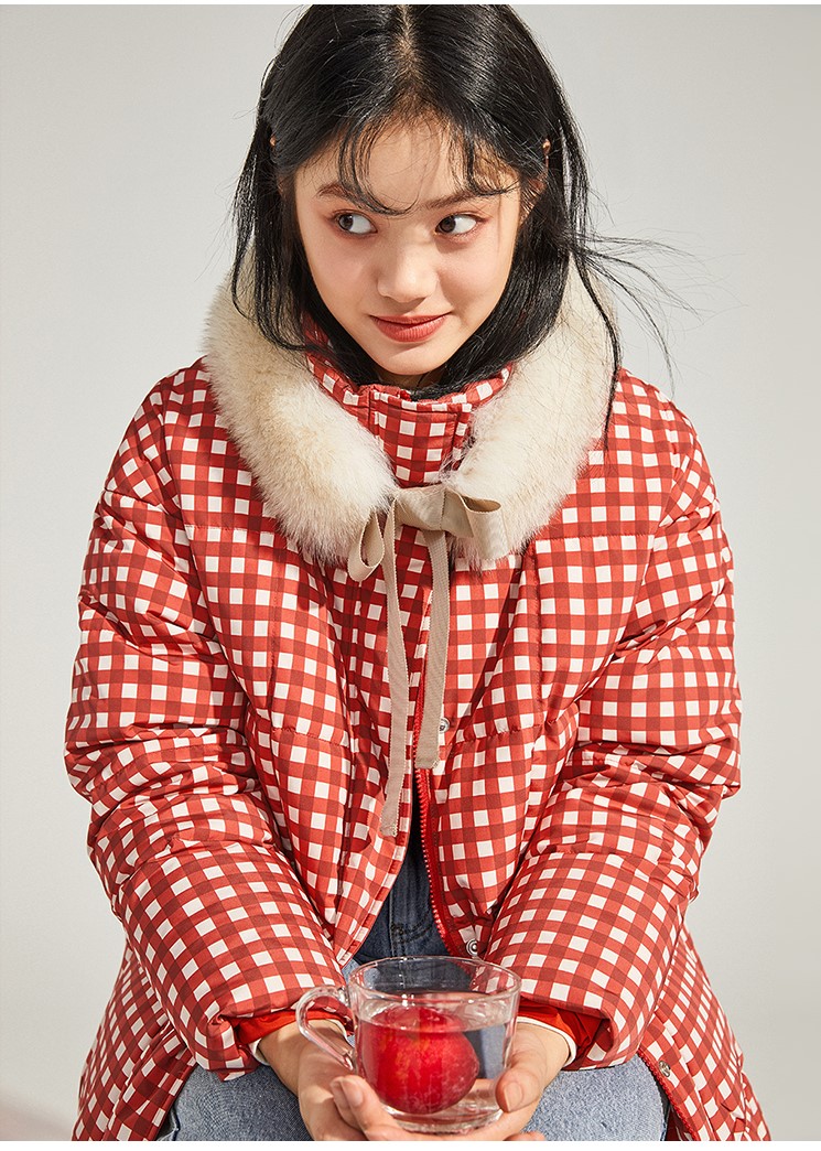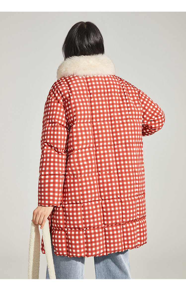 PEACE BIRD RED CHECK PADDED COAT WITH FAUX FUR HOOD