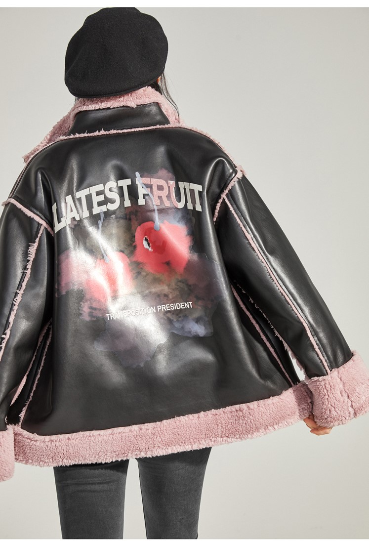 Go with the faux Faux-shearling spread collar Back print design Zip fastening Faux leather