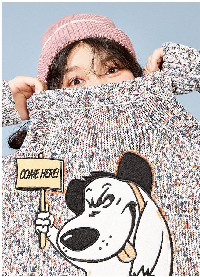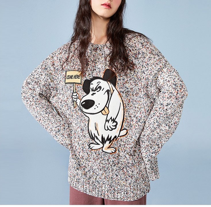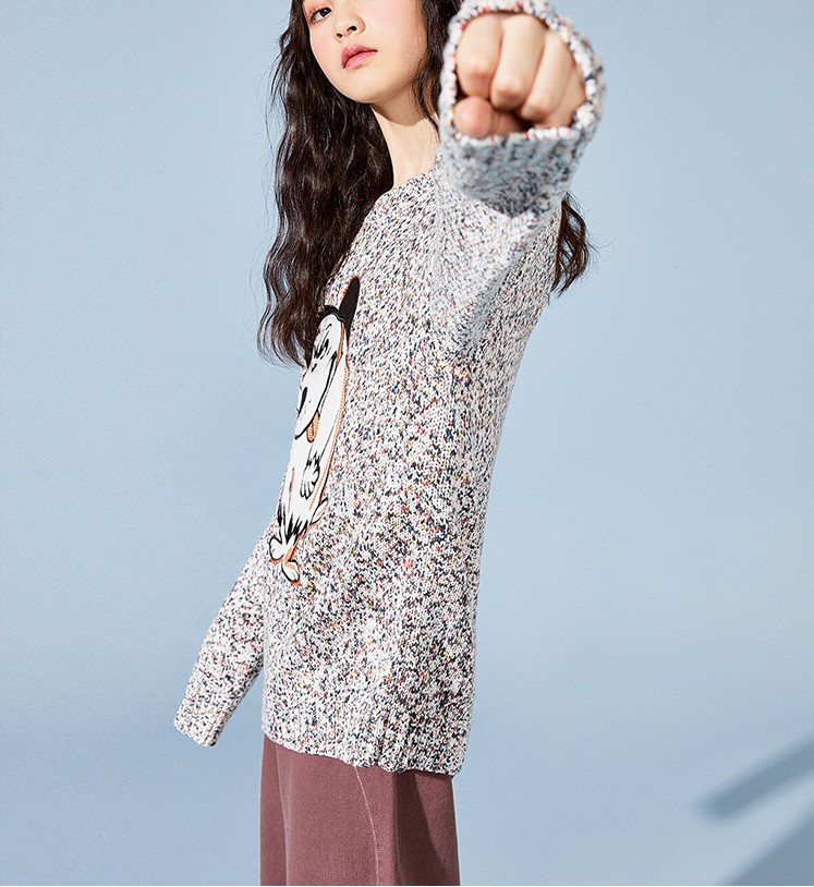 Round neck Cartoon embroidered design Long sleeves Fitted cuffs and hem Relaxed fit 100% multi knit