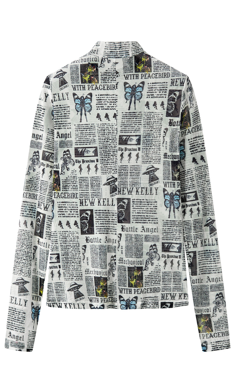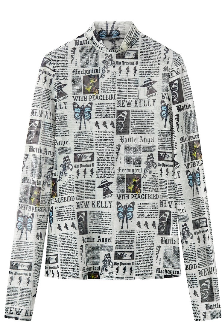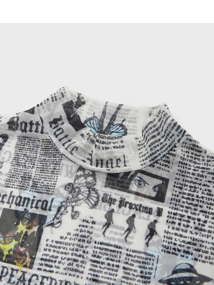 PEACE BIRD HIGH NECK LONG SLEEVE TOP IN NEWSPAPER PRINT MESH
