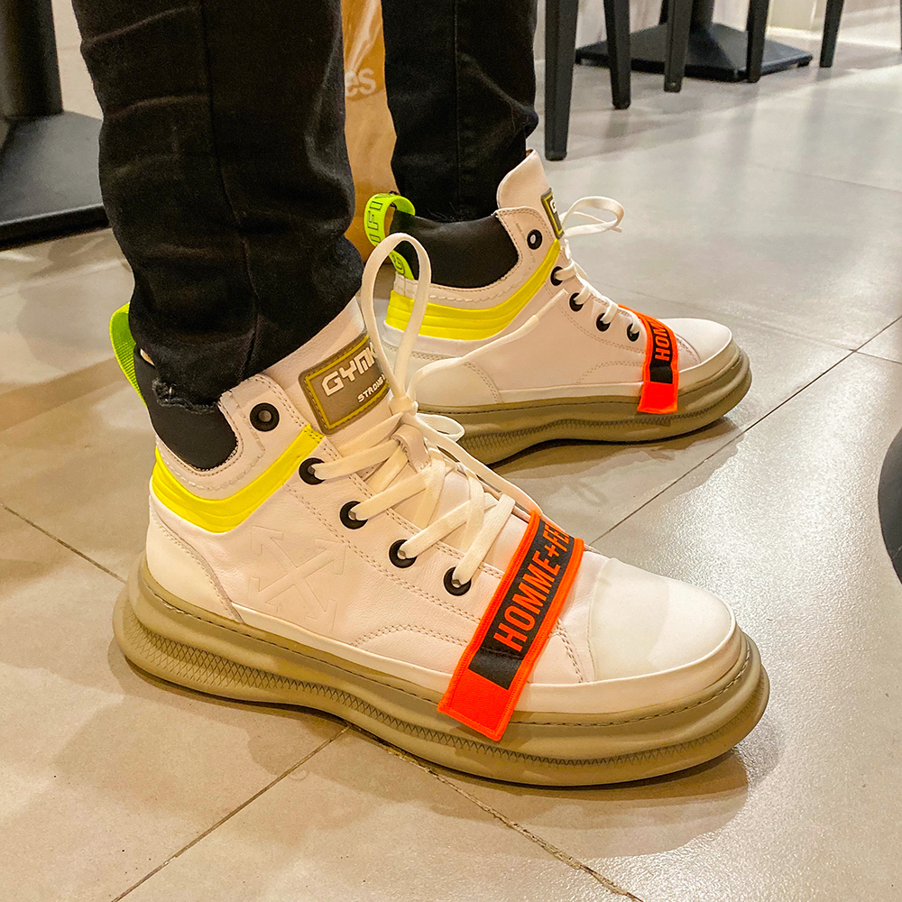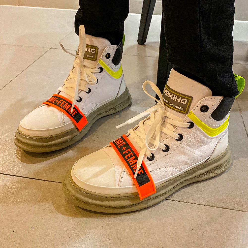 High-top design Tape detail Lace-up fastening Real leather Chunky sole