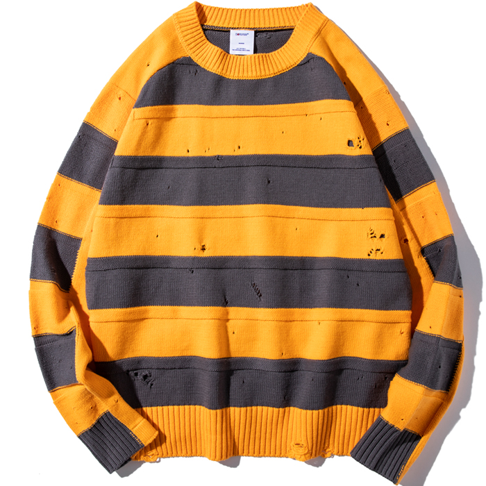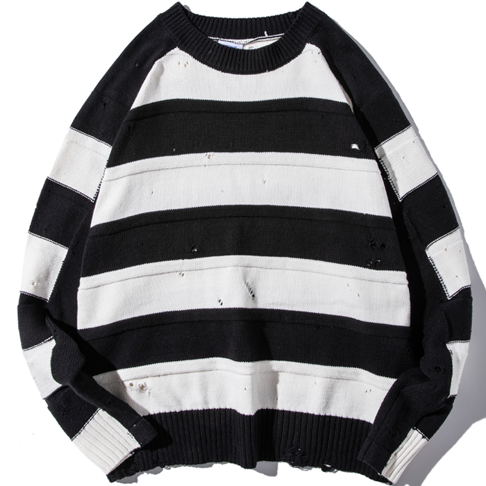 BOEZINGO HORIZONTAL STRIPES CREW NECK RIPPED SWEATERS