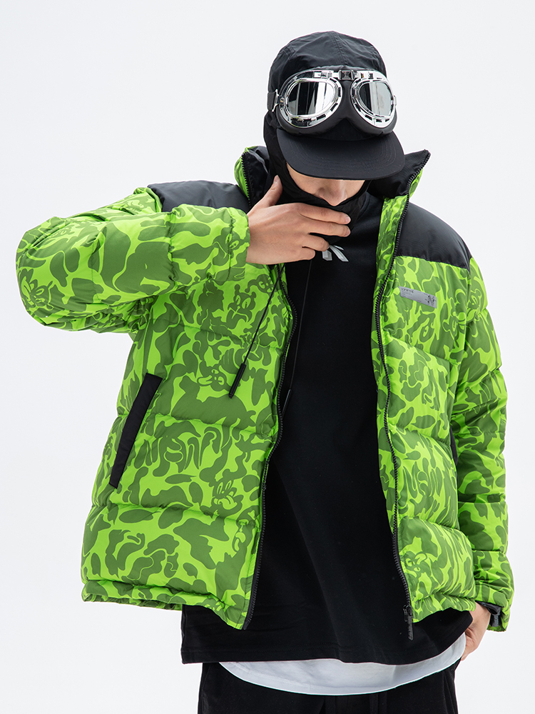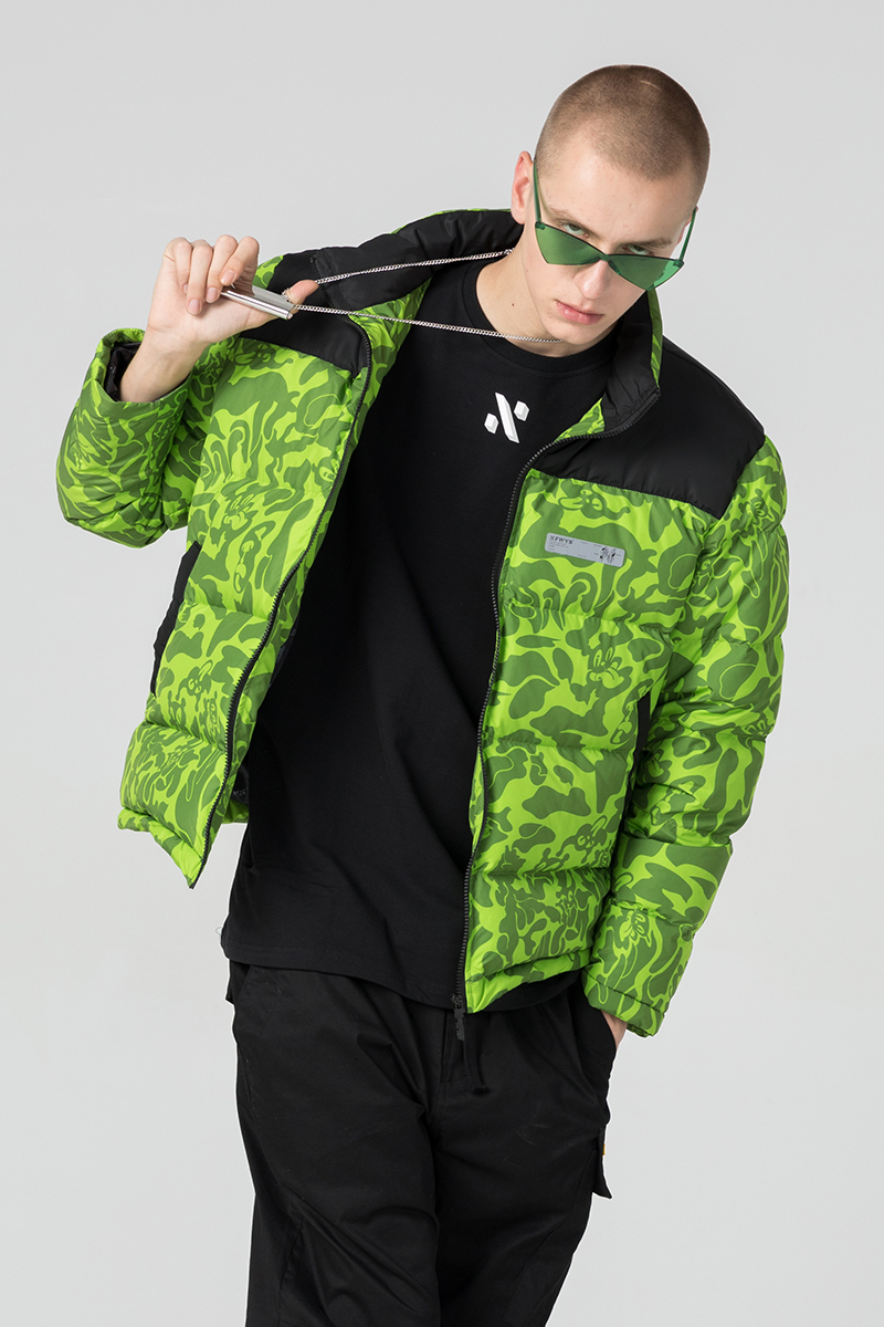 NFWYS FIZOLA HOLOGRAPHIC HIGH NECK BOMBER JACKET IN GREEN CAMO