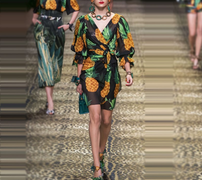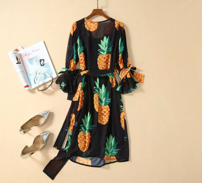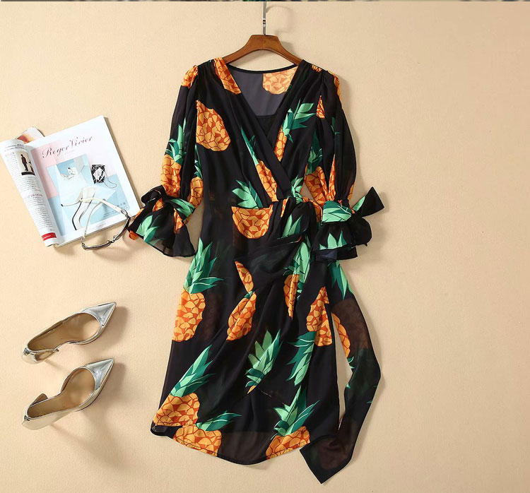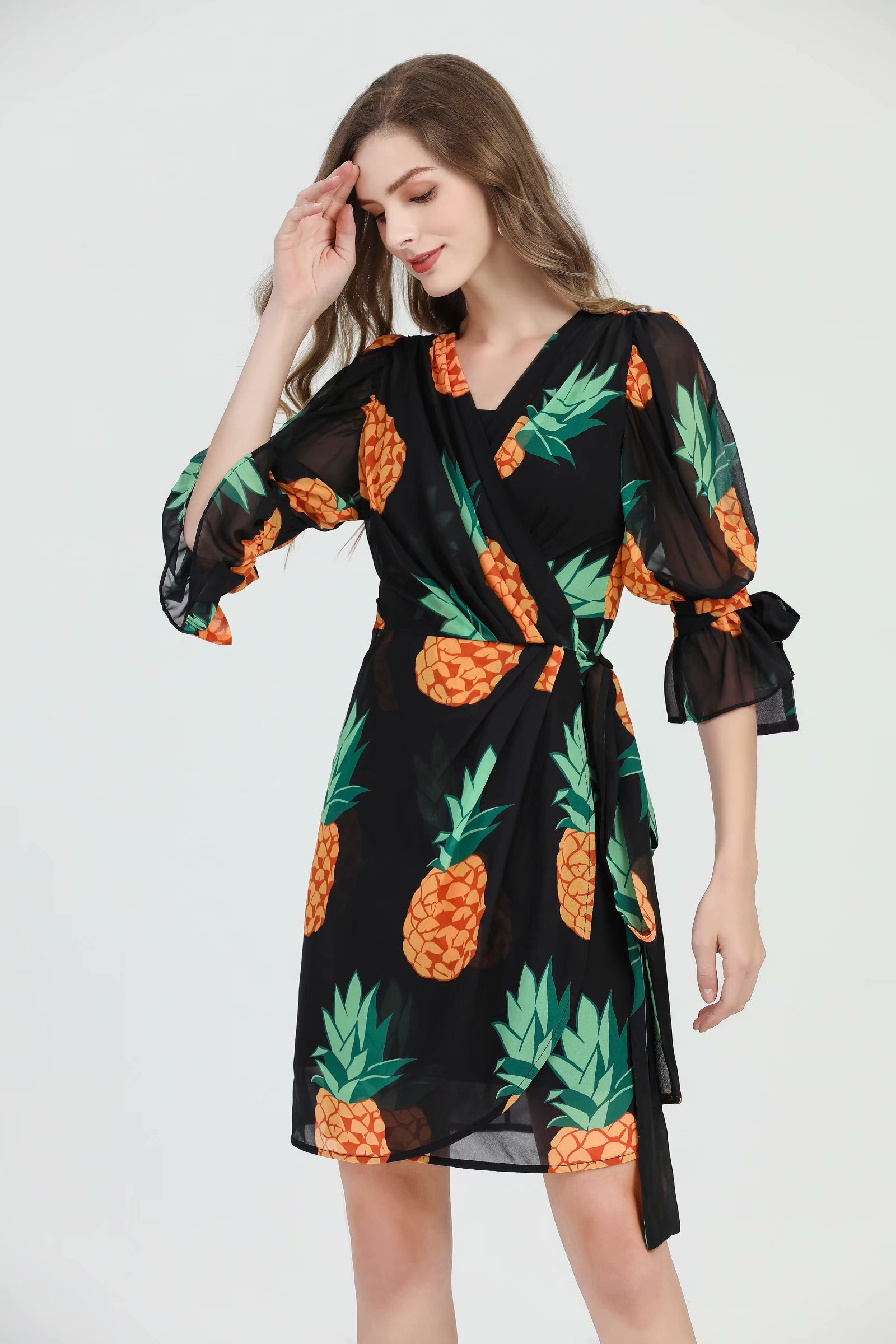 BBL DESIGN PINEAPPLE PRINT WRAP DRESS WITH TIE SLEEVES