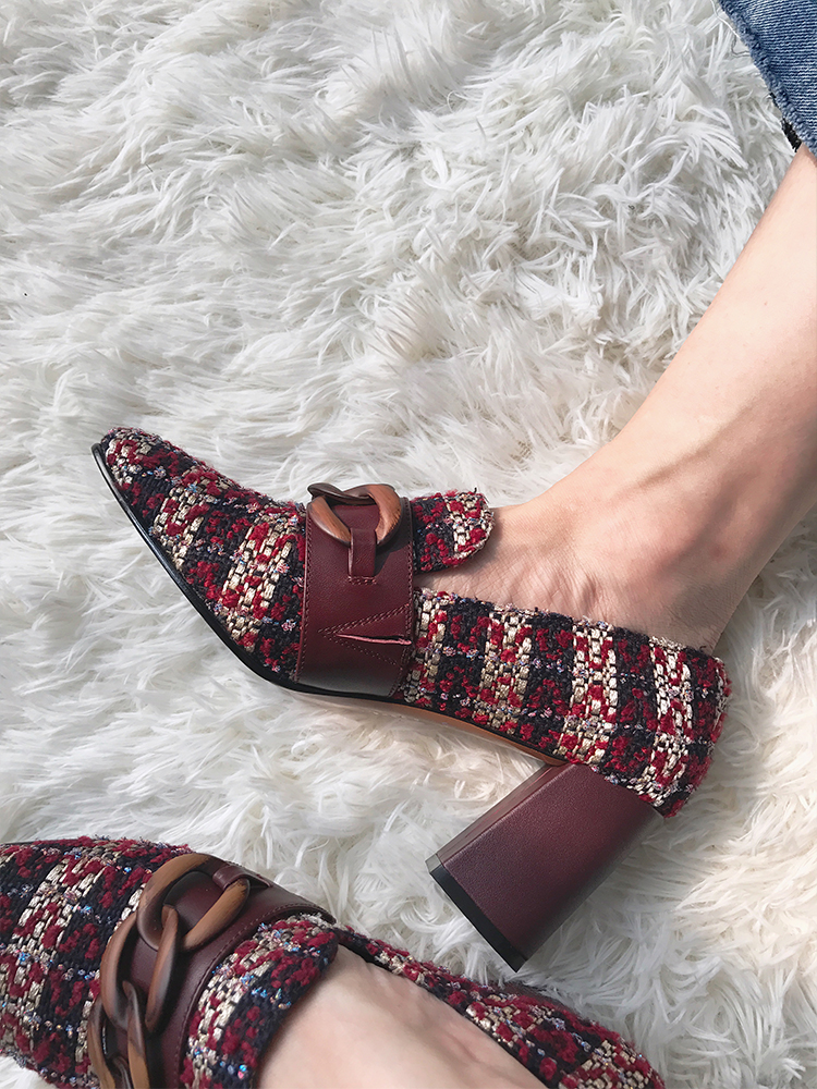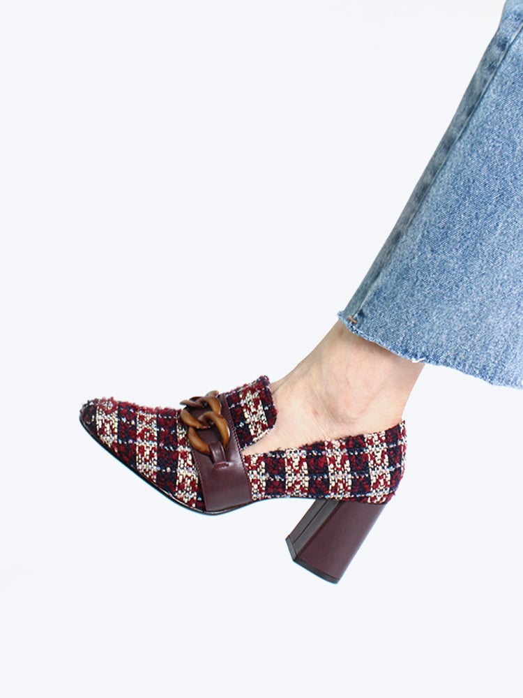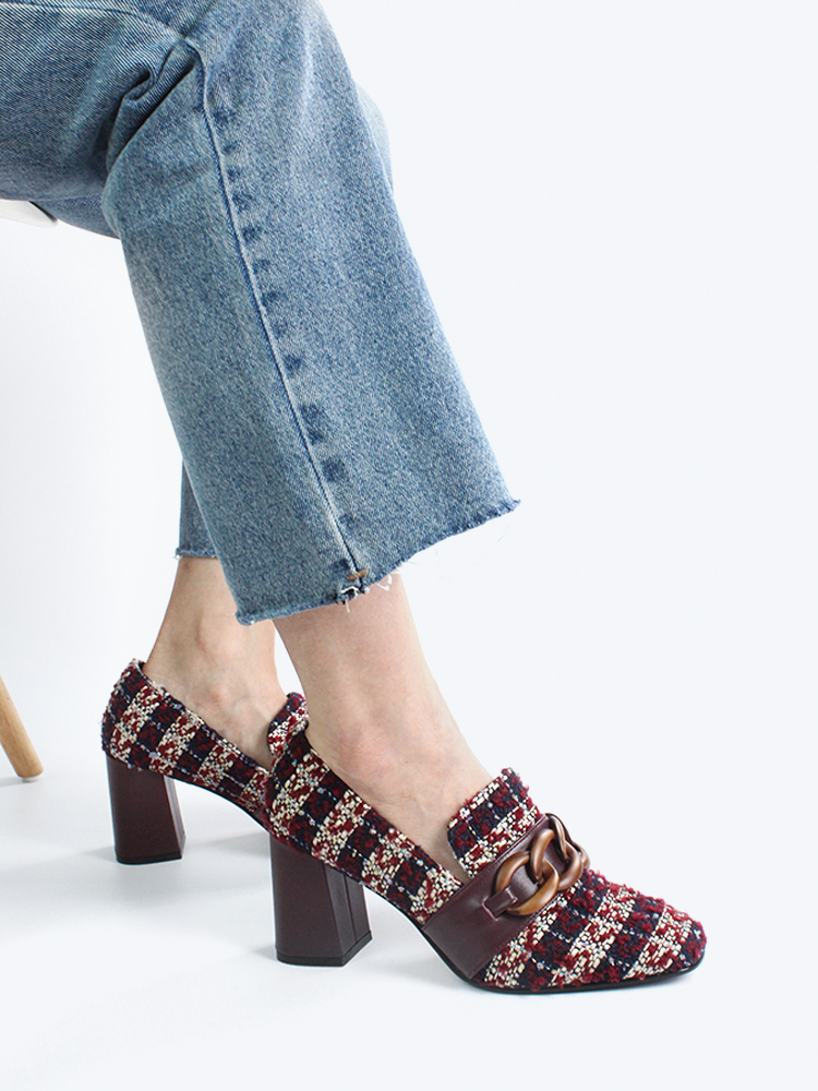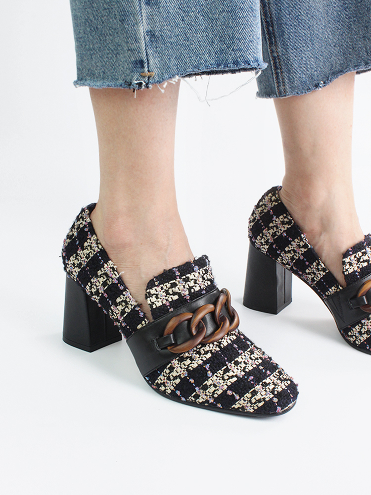 Square toe Slip-on style Chain detail Block heel