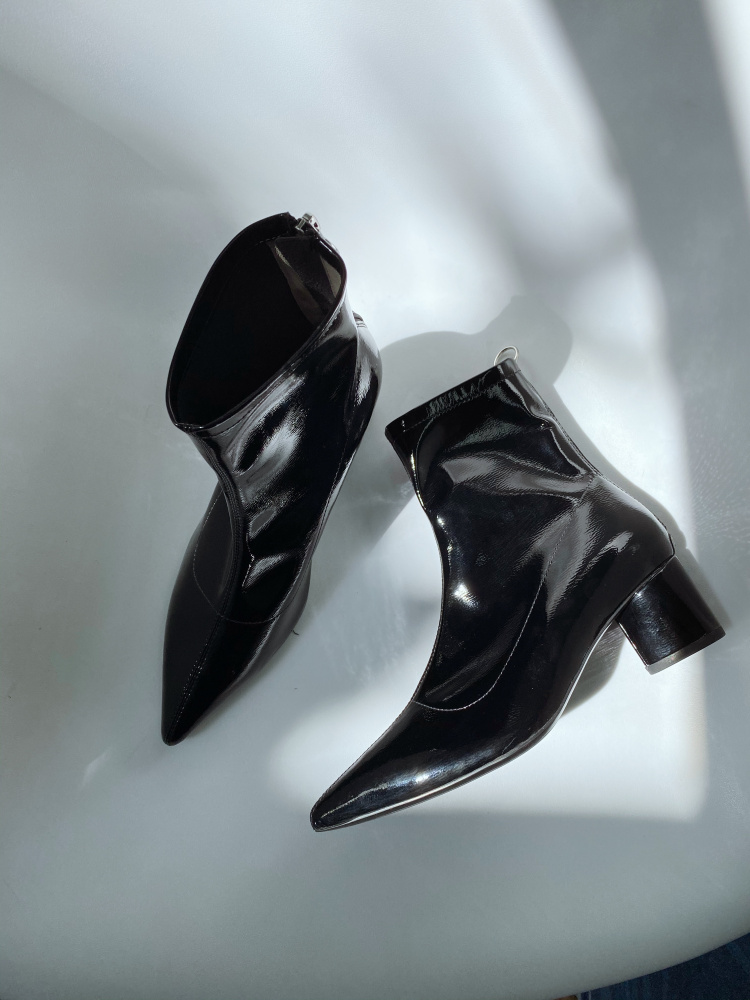 LUXE SEVEN DESIGN ZIP BACK ANKLE BOOTS IN BLACK PATENT