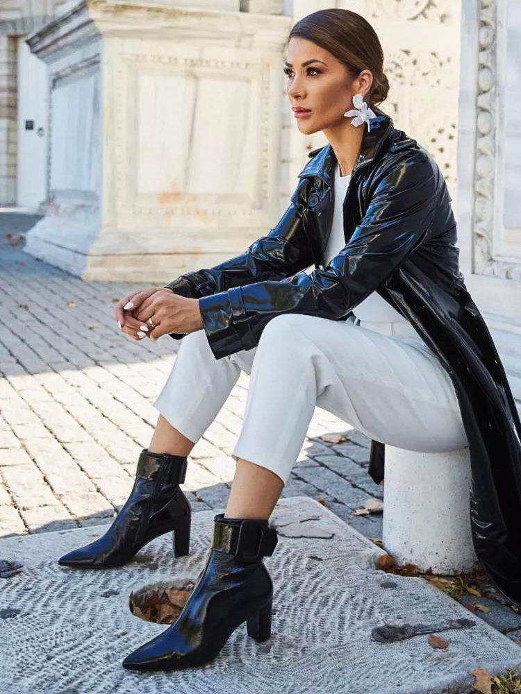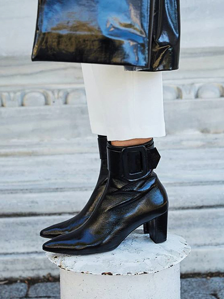 Buckle strap to ankle Zip-side fastening Pointed toe Block eel