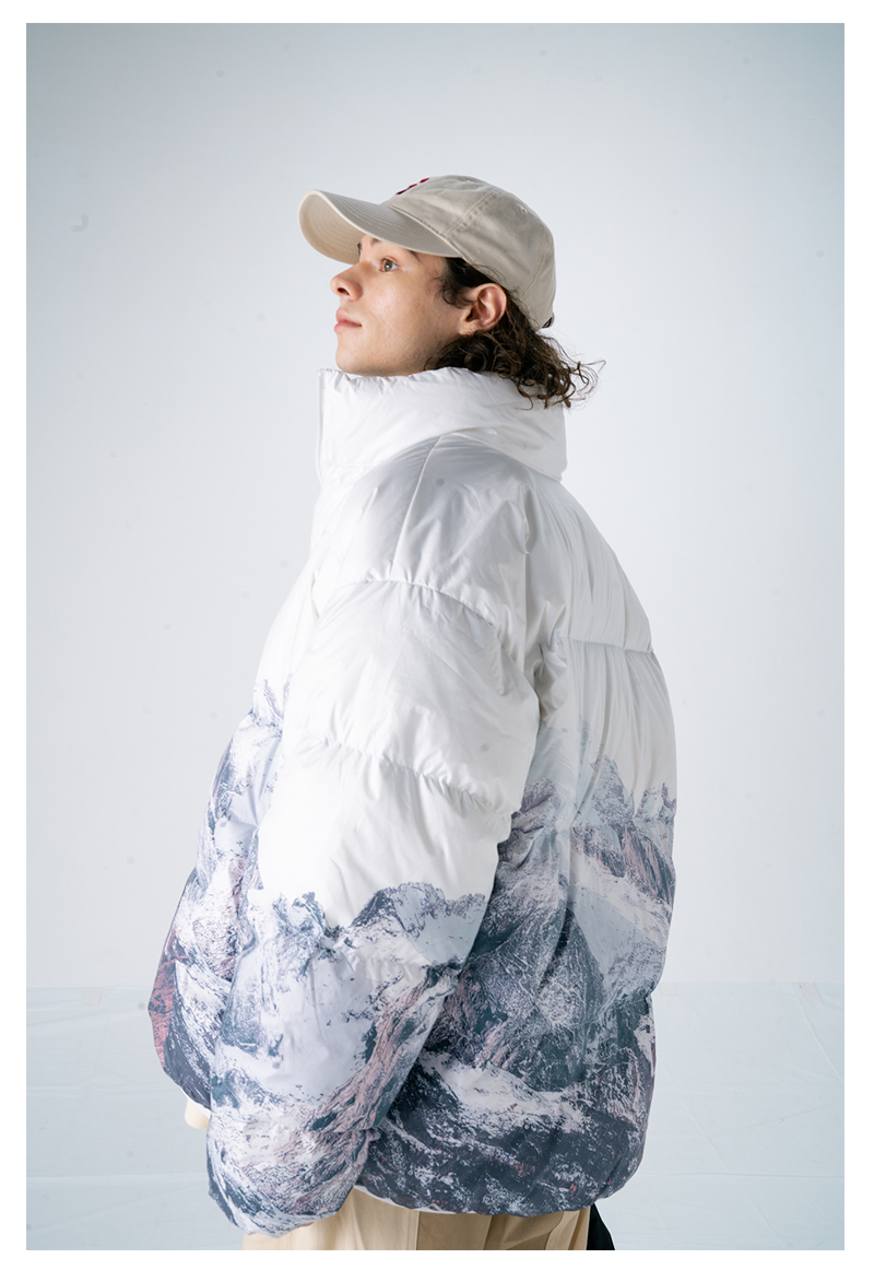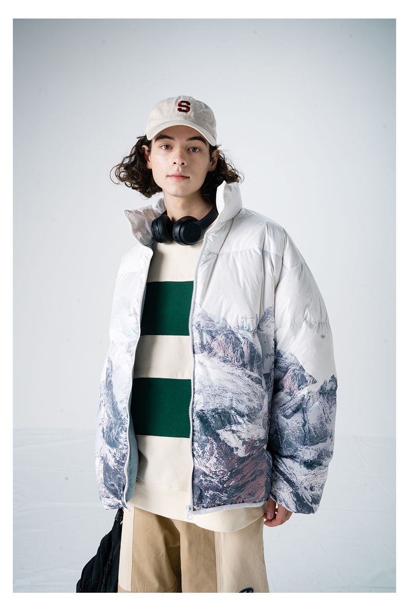 DOLENZO SNOW MOUNTAIN DIGITAL PRINT HIGH NECK THICK DOWN JACKET