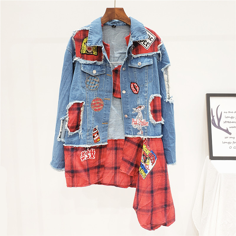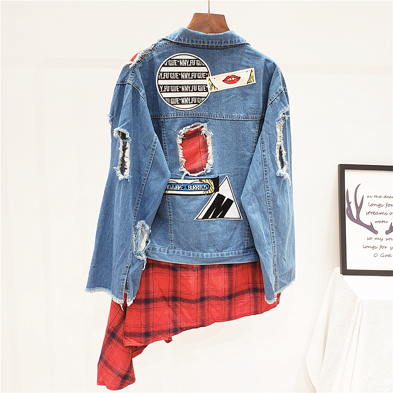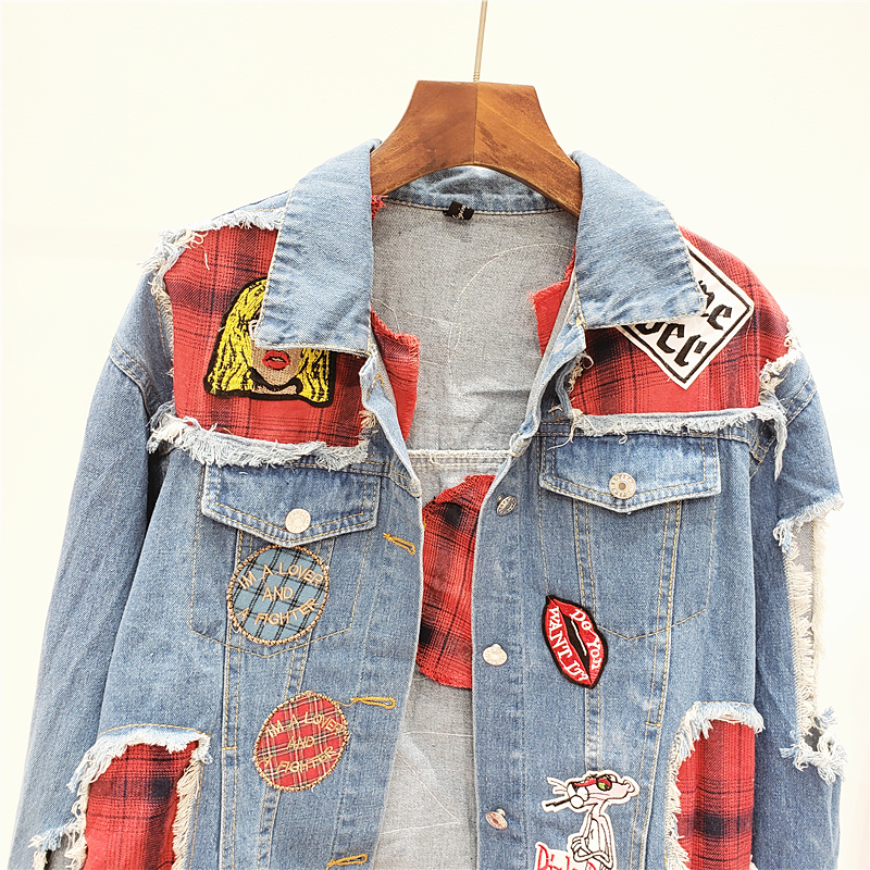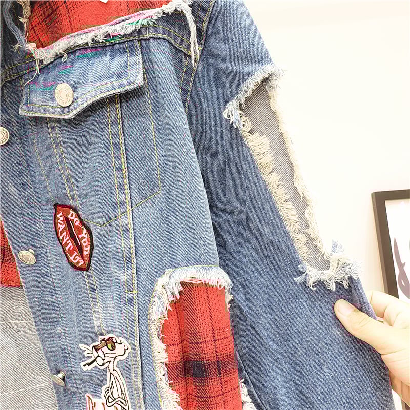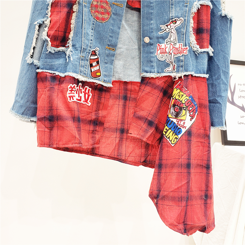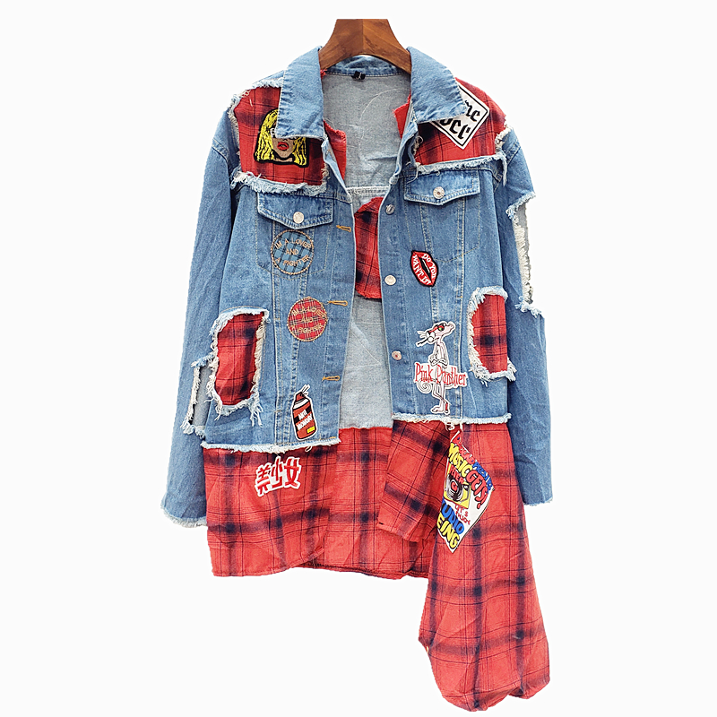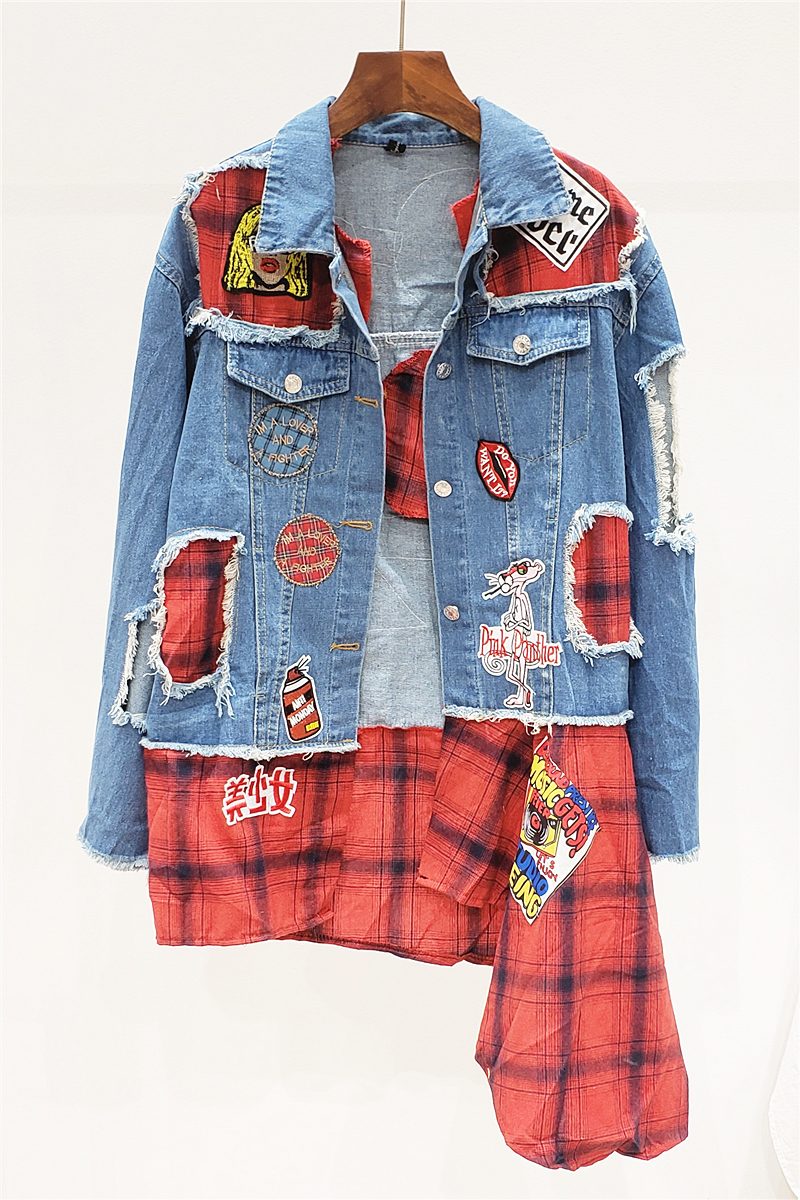 GIANA ZCHMUNKE HANDMADE ASYMMETRICAL BADGE PATCH RIPPED DENIM WOMEN JACKET