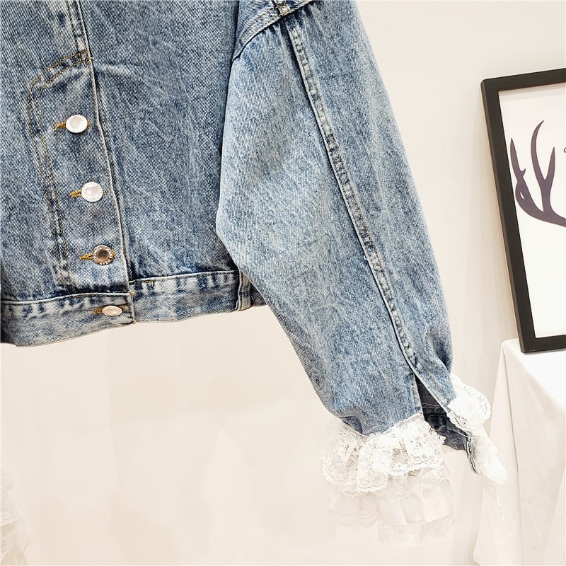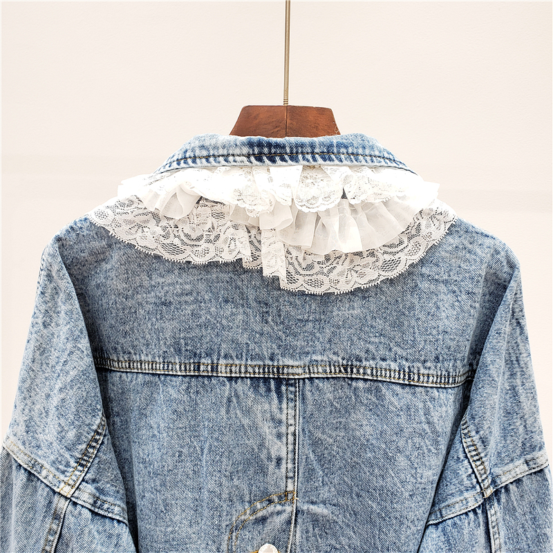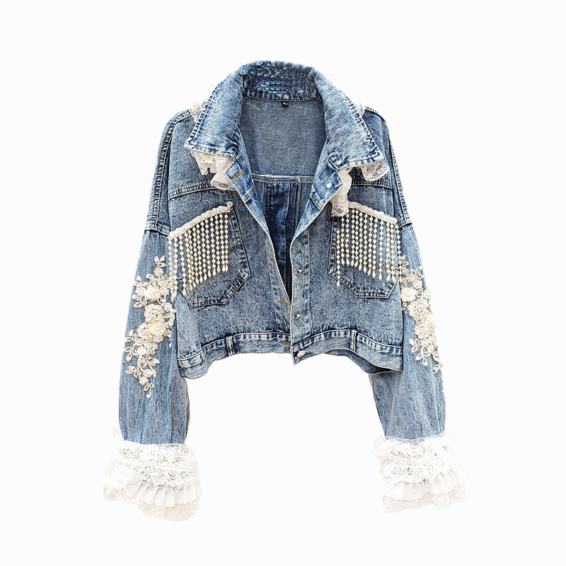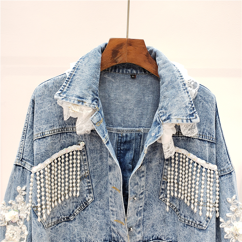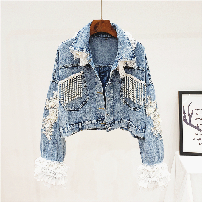 ZANY VENDOM RETRO STYLE LUXURY BEADED PEARL LACE EDGE DENIM WOMEN JACKET