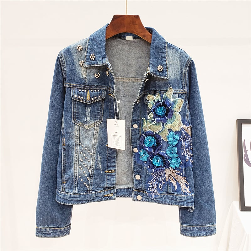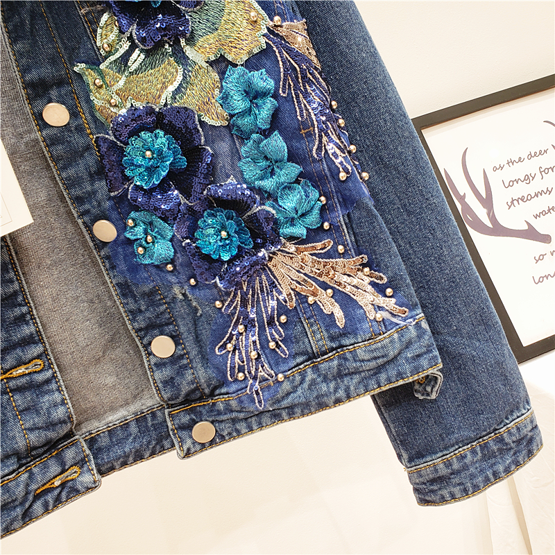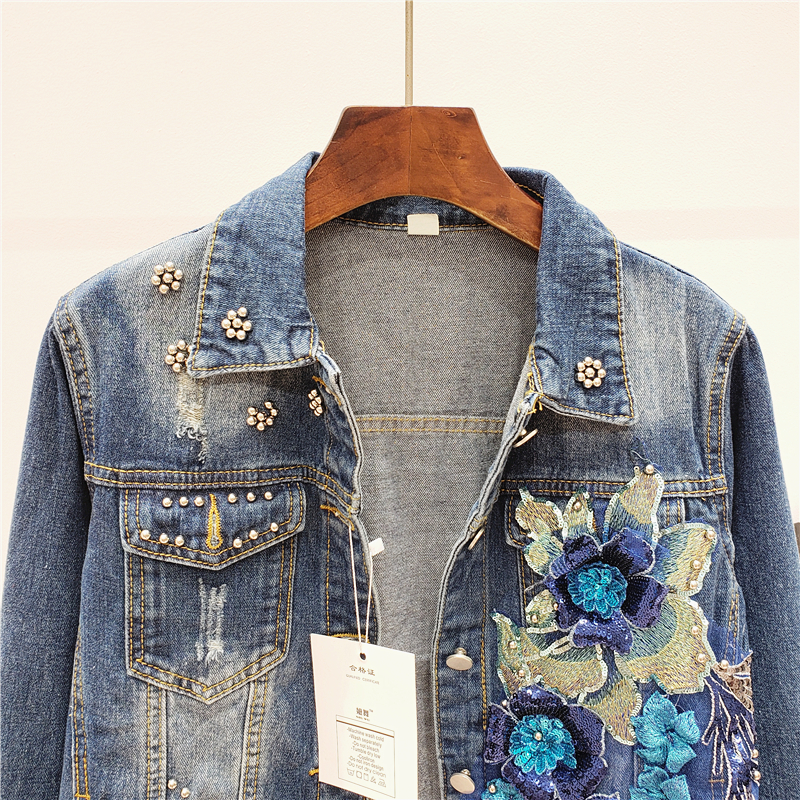 ZANY VENDOM RETRO STYLE HANDMADE LUXURY BEADED FLOWER DENIM JACKET WITH RHINESTONE