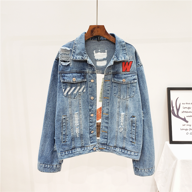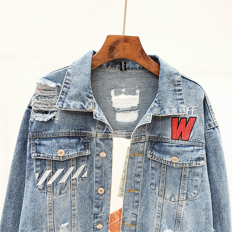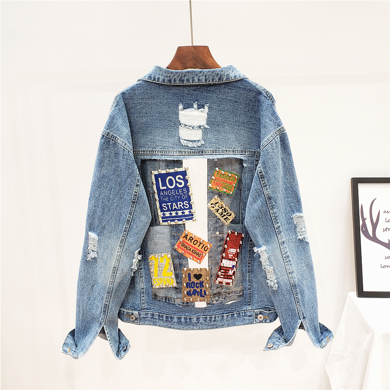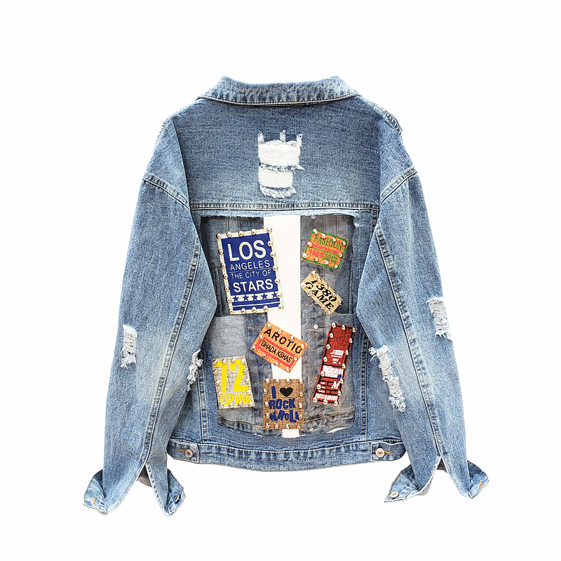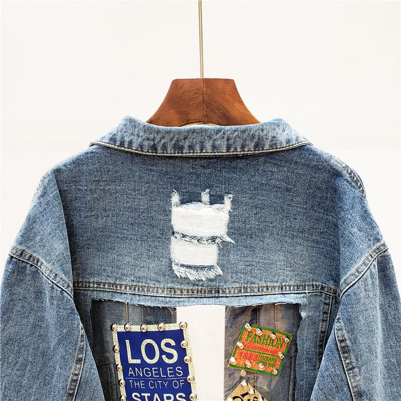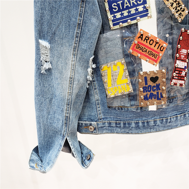 VENDOM AROTIO HANDMADE TRANSPARENT PATCHWORK RIPPED DENIM JEAN WOMEN JACKET WITH RIVET