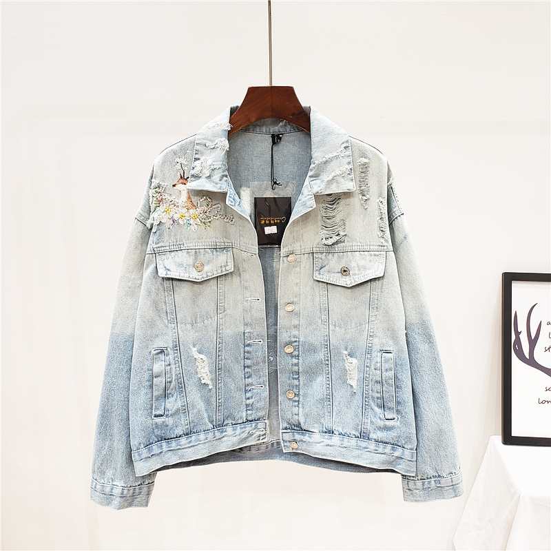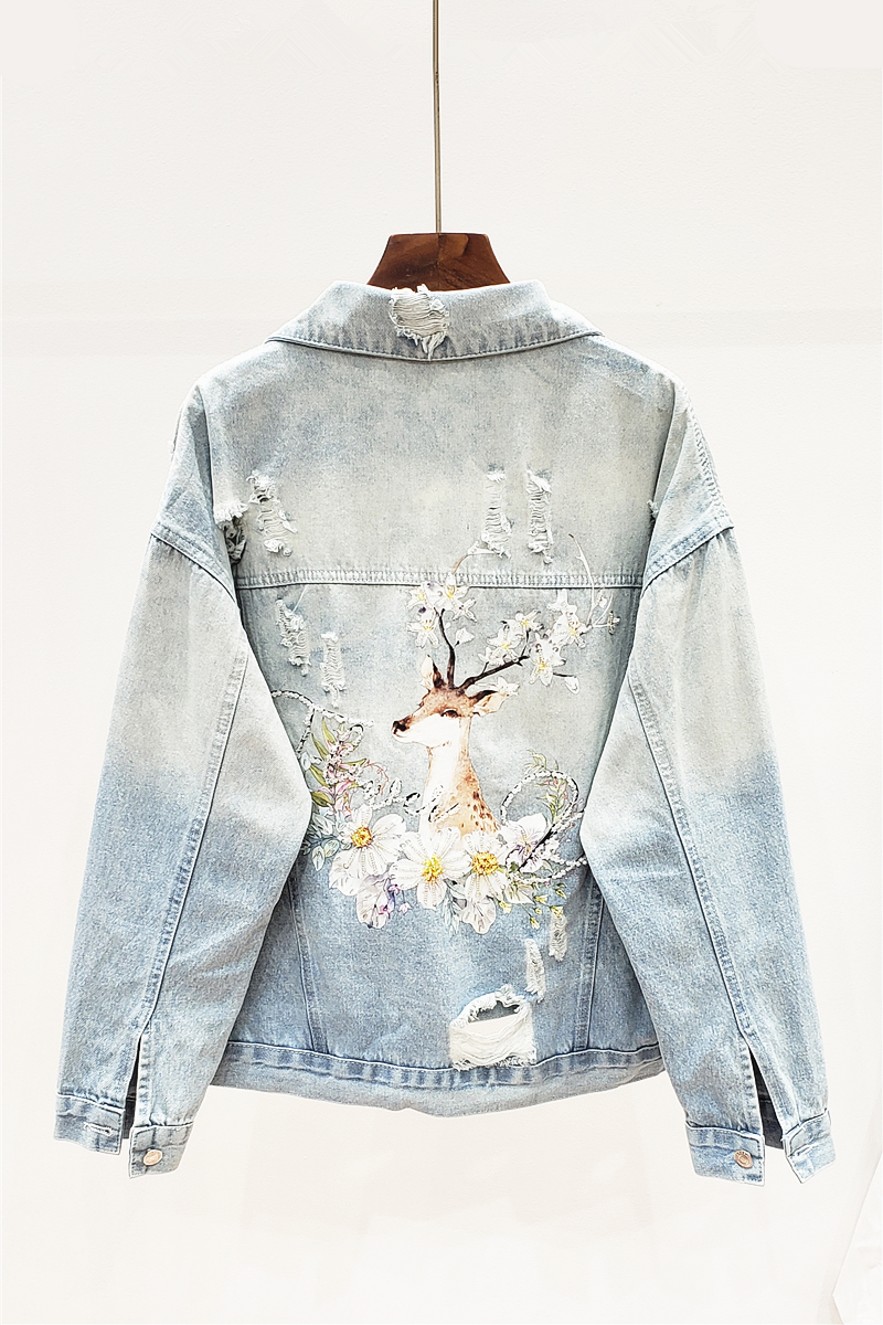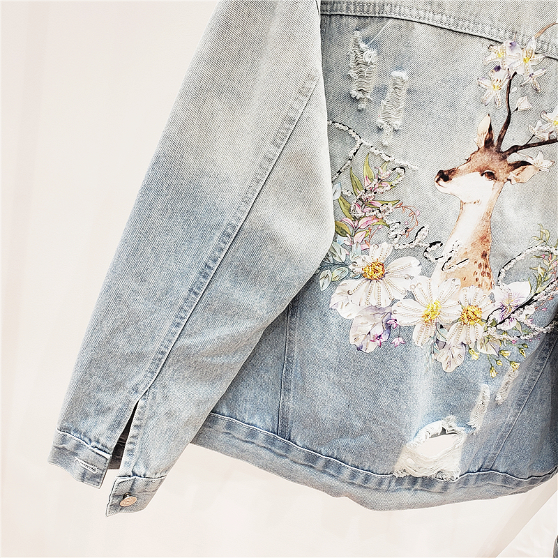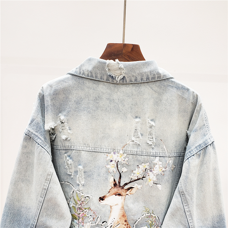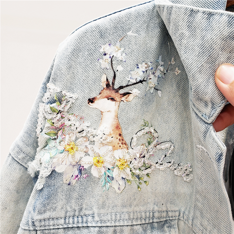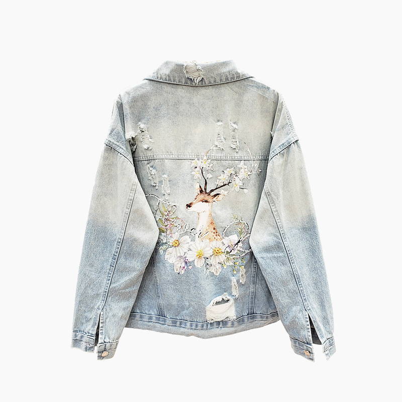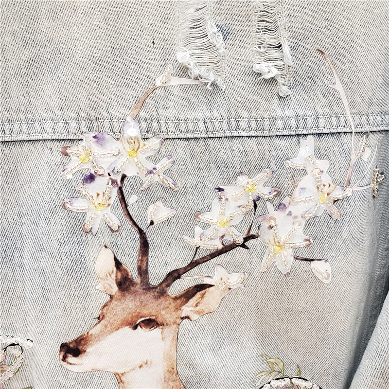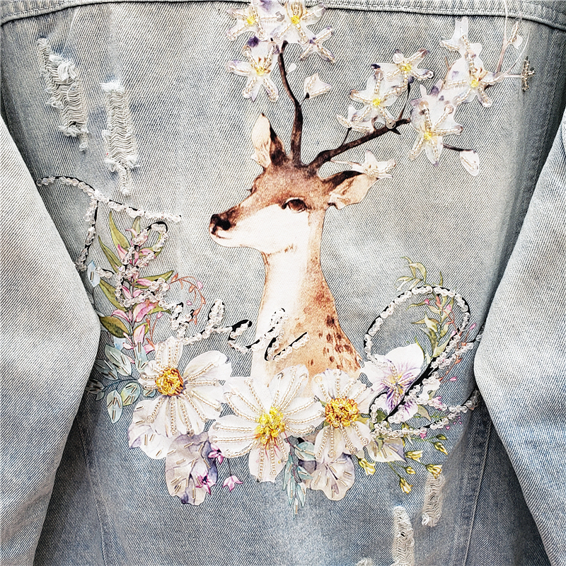 GAFFO AROTIO HANDMADE DEER AND FLOWER EMBROIDERED DENIM JEAN WOMEN JACKET