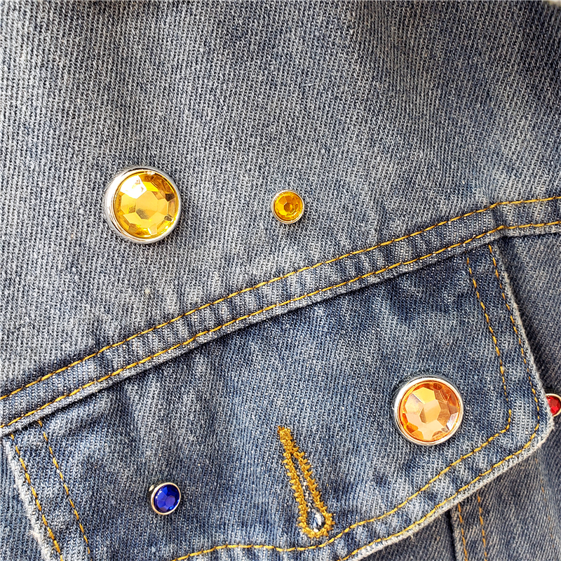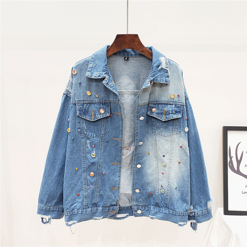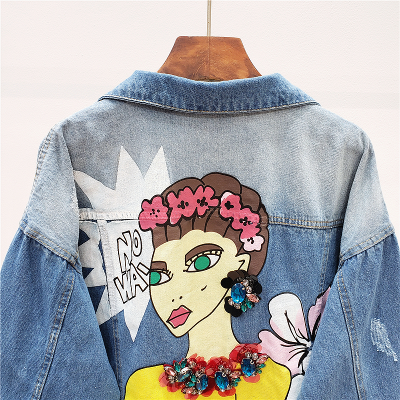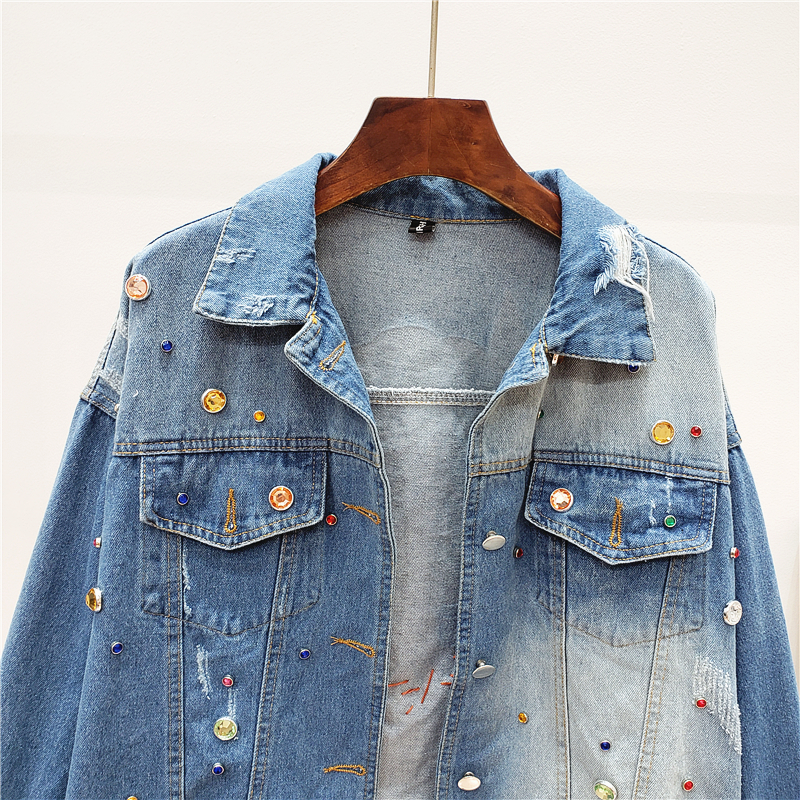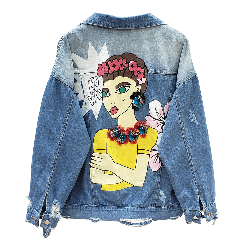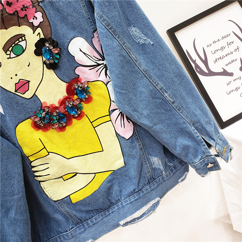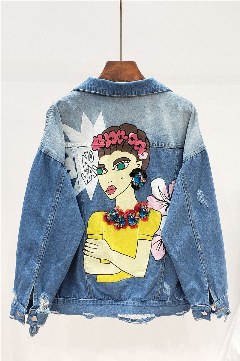 JOYA PALF HANDMADE HAWAII GIRL RIPPED DENIM JEAN COAT WITH RHINESTONE