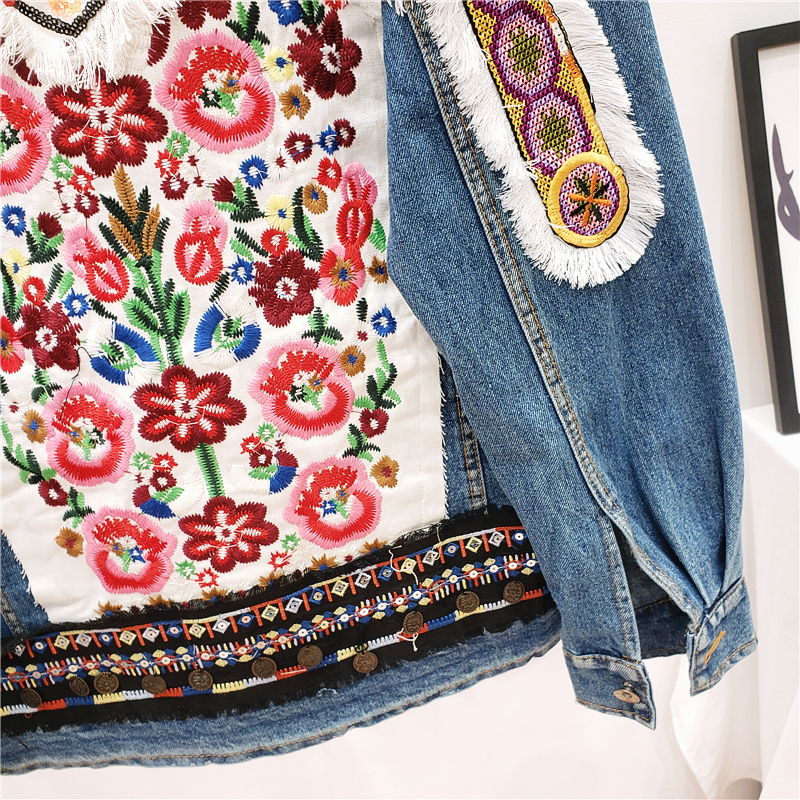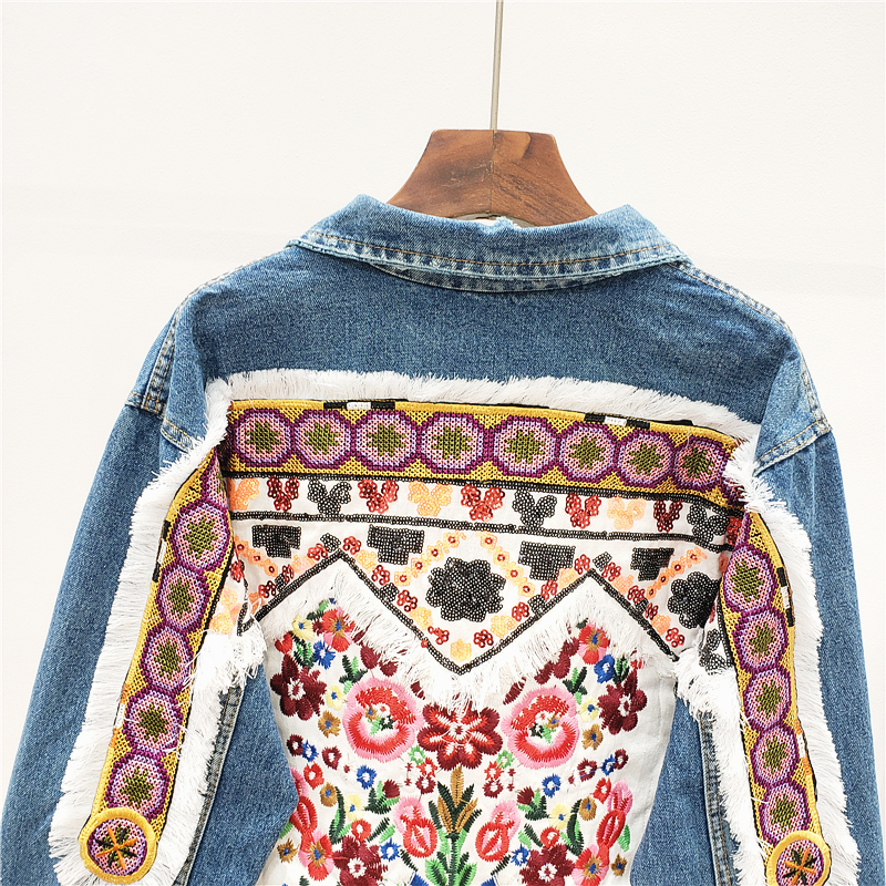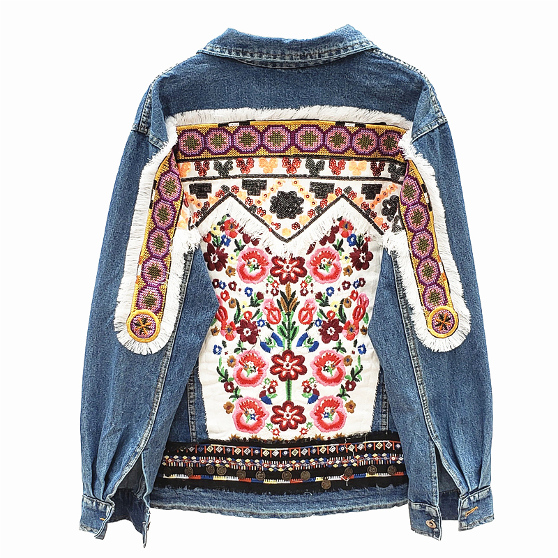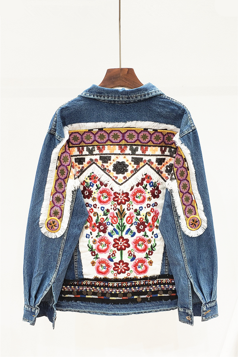 JEYYO CATHRO RETRO ETHNIC FLOWER EMBROIDERED BEADED SEQUIN DENIM JEAN JACKET