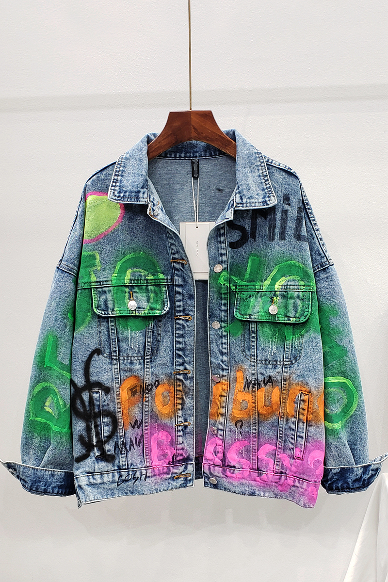 ZAY PUFFLO RETRO STYLE HAND PAINTED GRAFFITI DENIM JEAN WOMEN JACKET