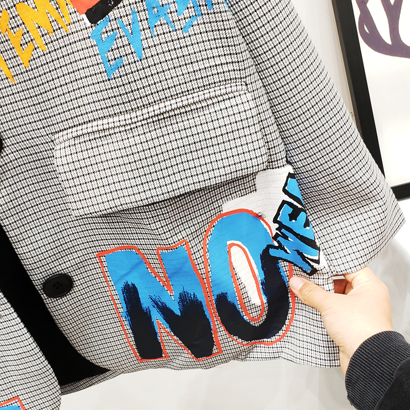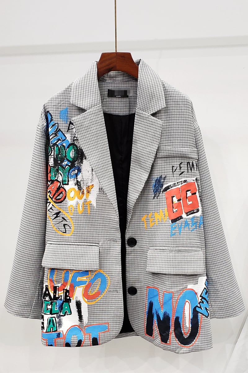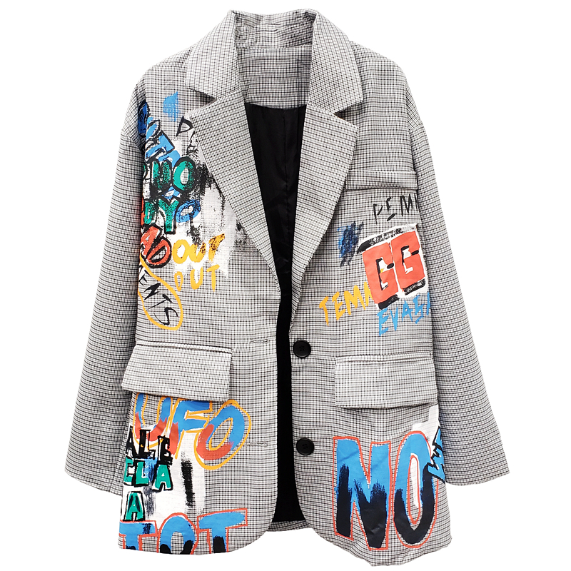 ZAY PUFFLO RETRO STYLE HAND PAINTED PLAID GRAFFITI MID LENGTH WOMEN JACKET