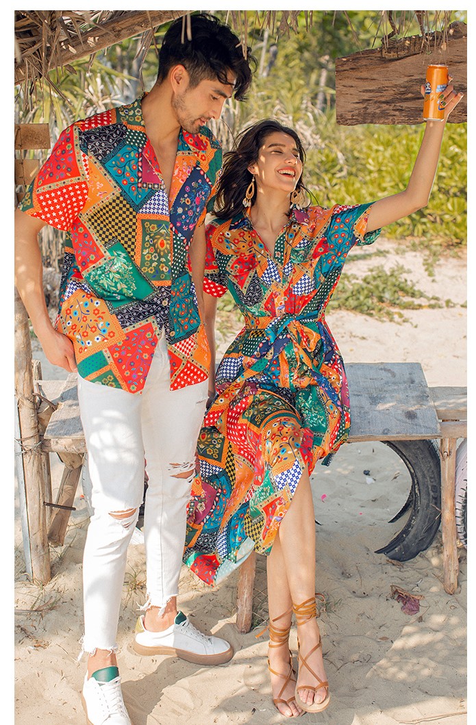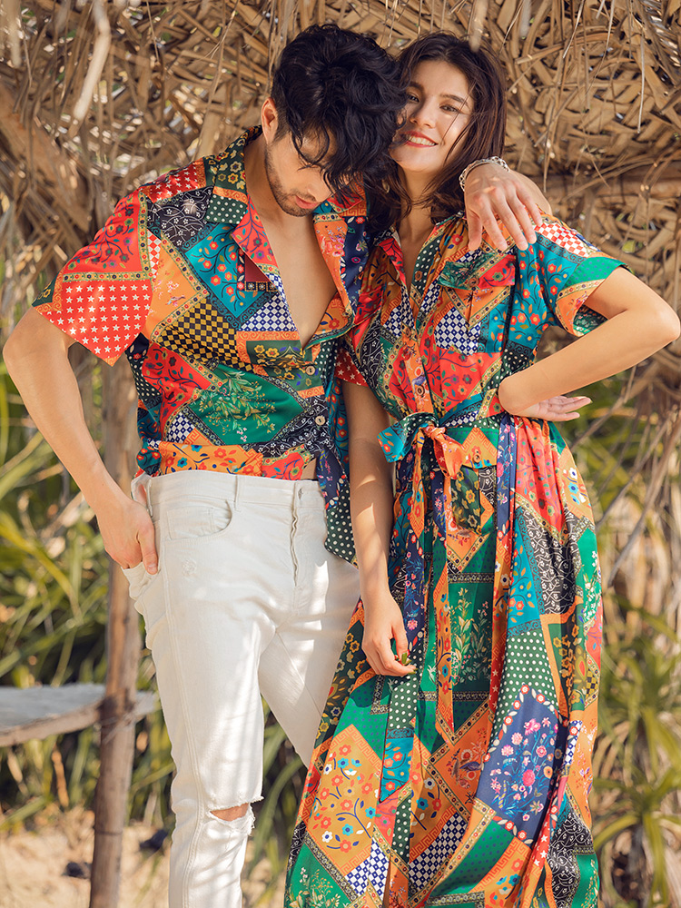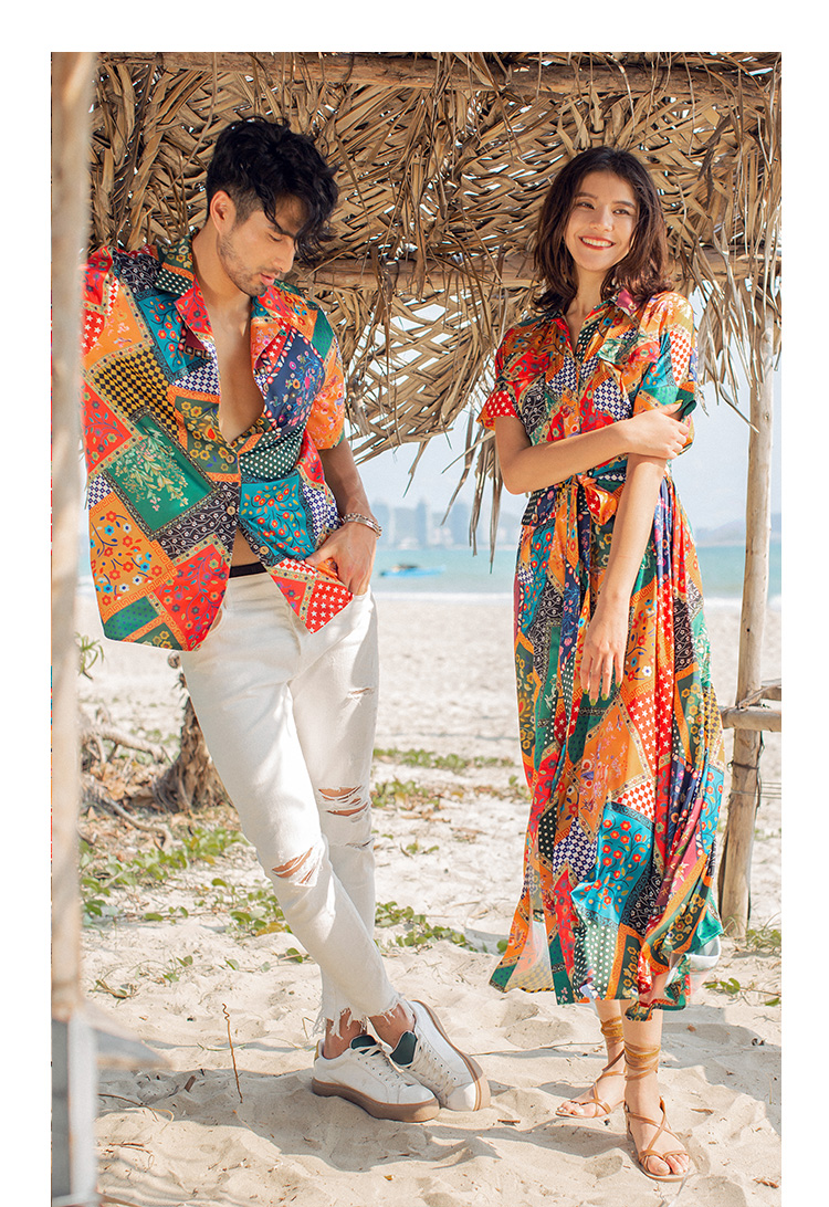 Printed design Printed design Button placket Short sleeve Lightweight woven fabric Drapes softly over the body