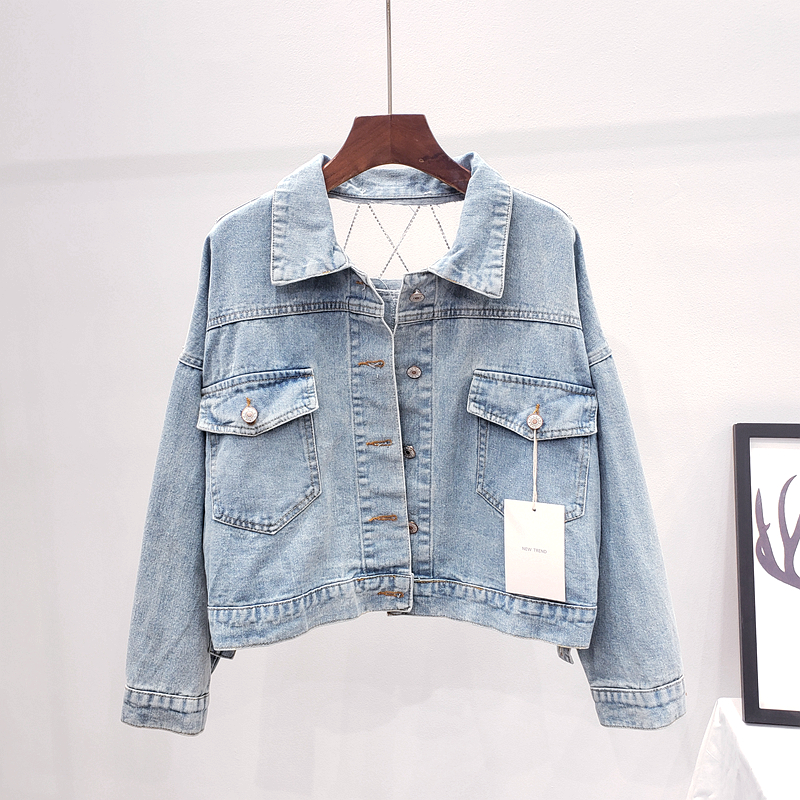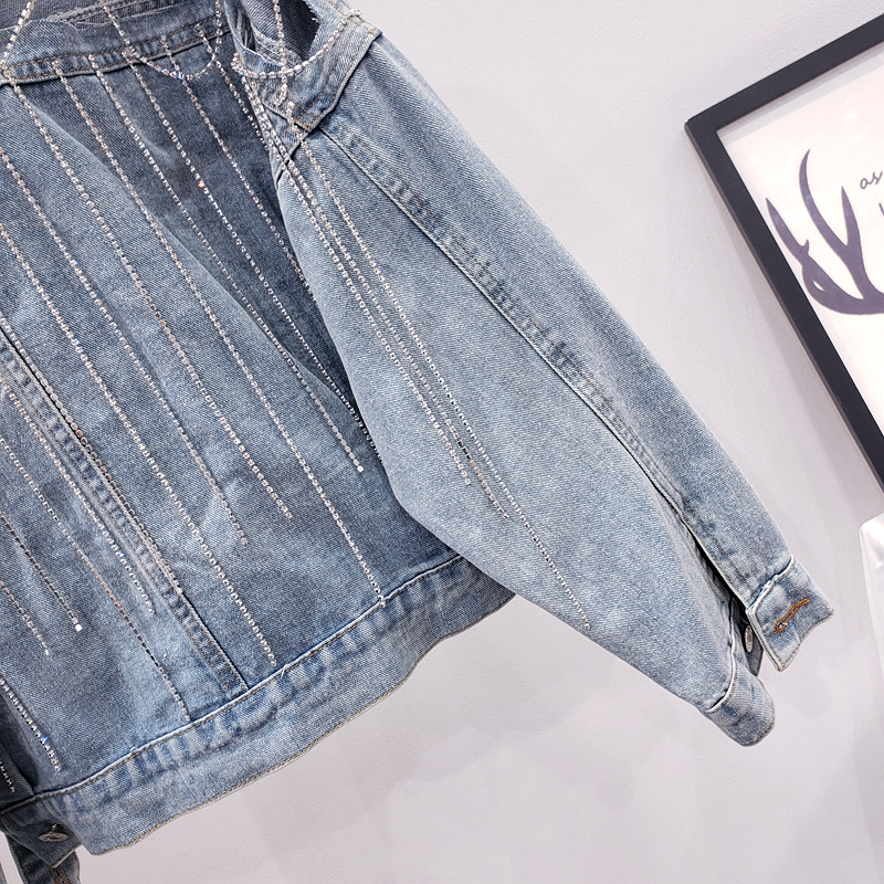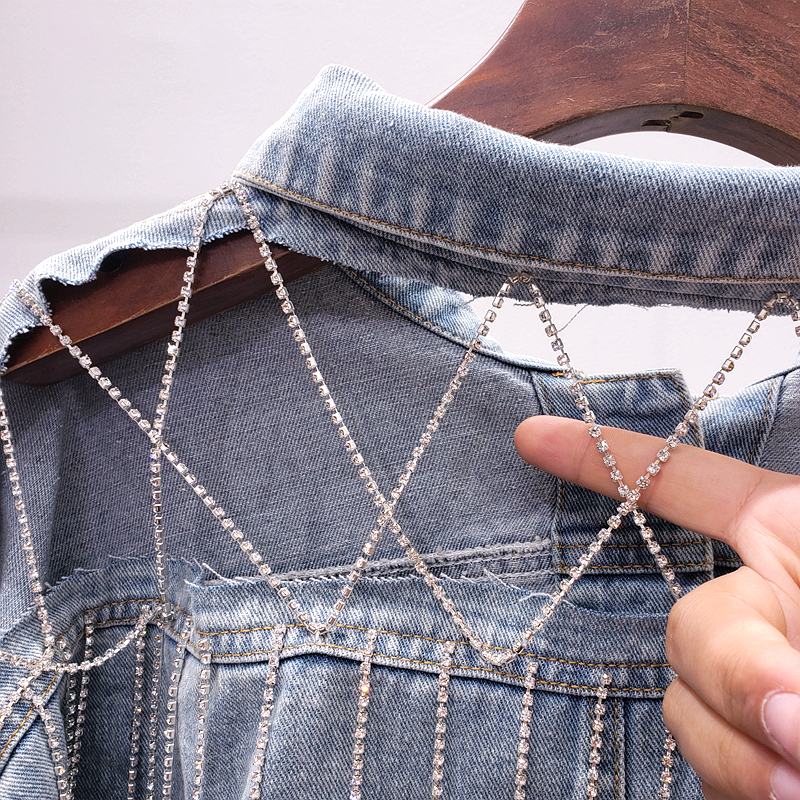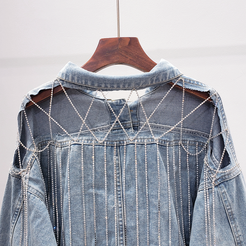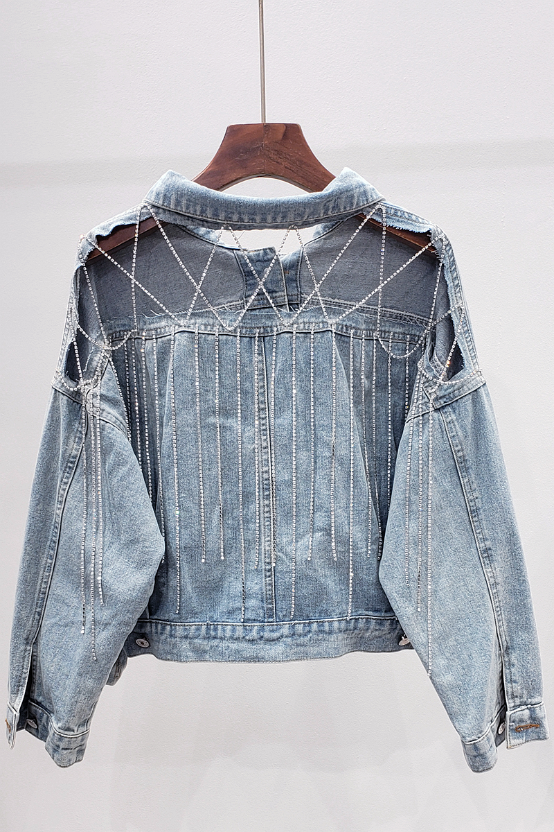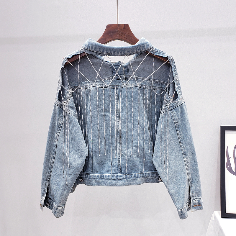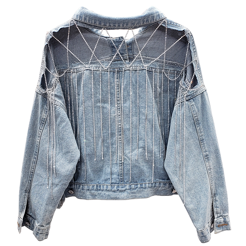 FIMNIN PUFFLO OPEN BACK DENIM JEAN WOMEN JACKET WITH TASSEL RHINESTONE