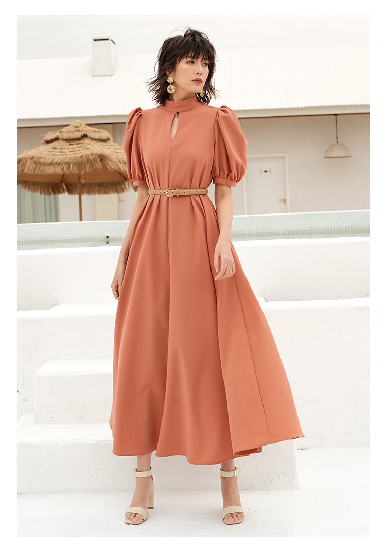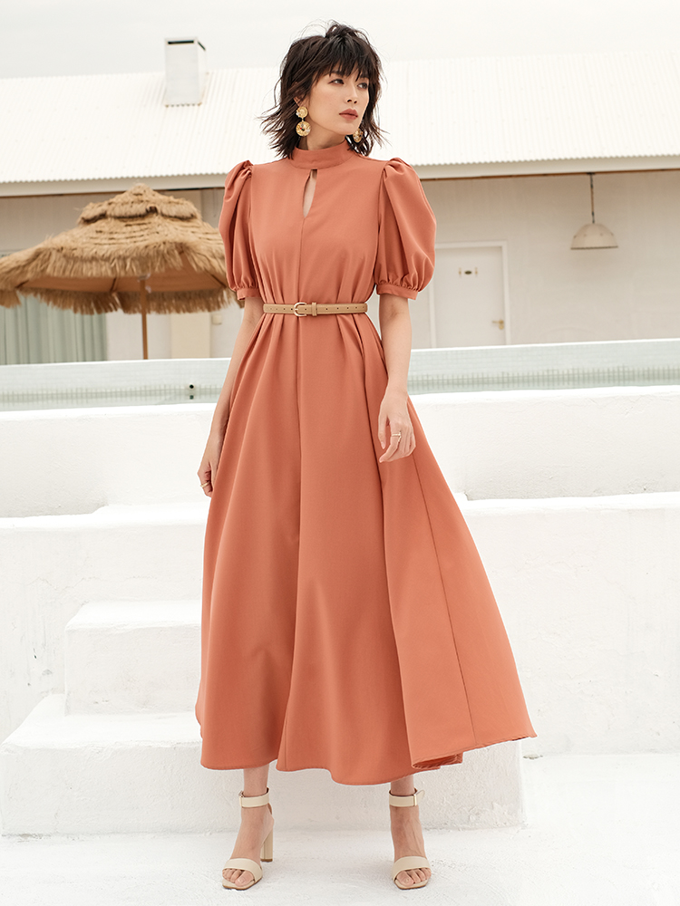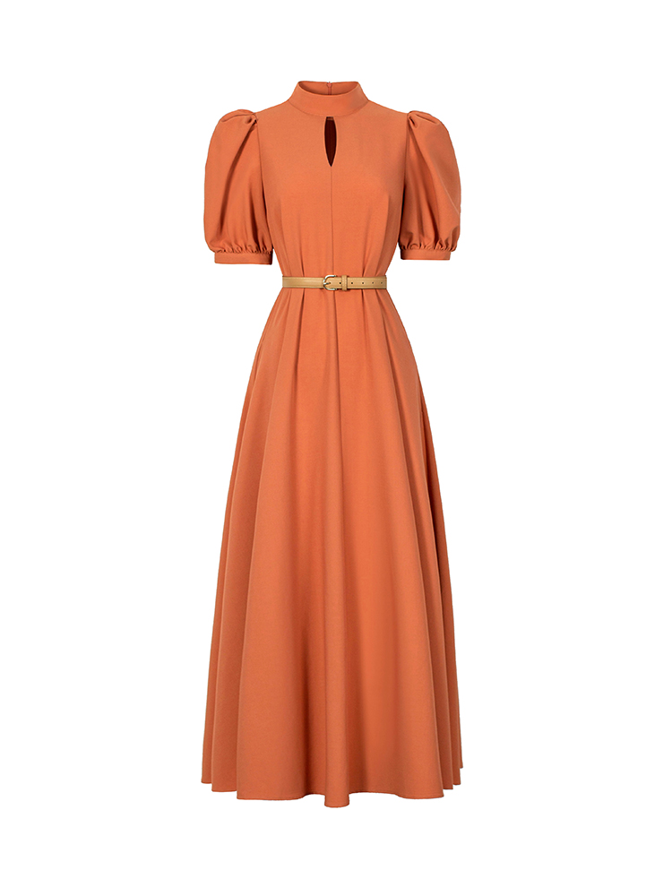 VERRAGE HIGH NECK BELTED MIDI DRESS WITH PUFF SLEEVE