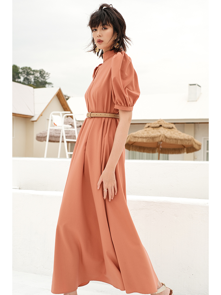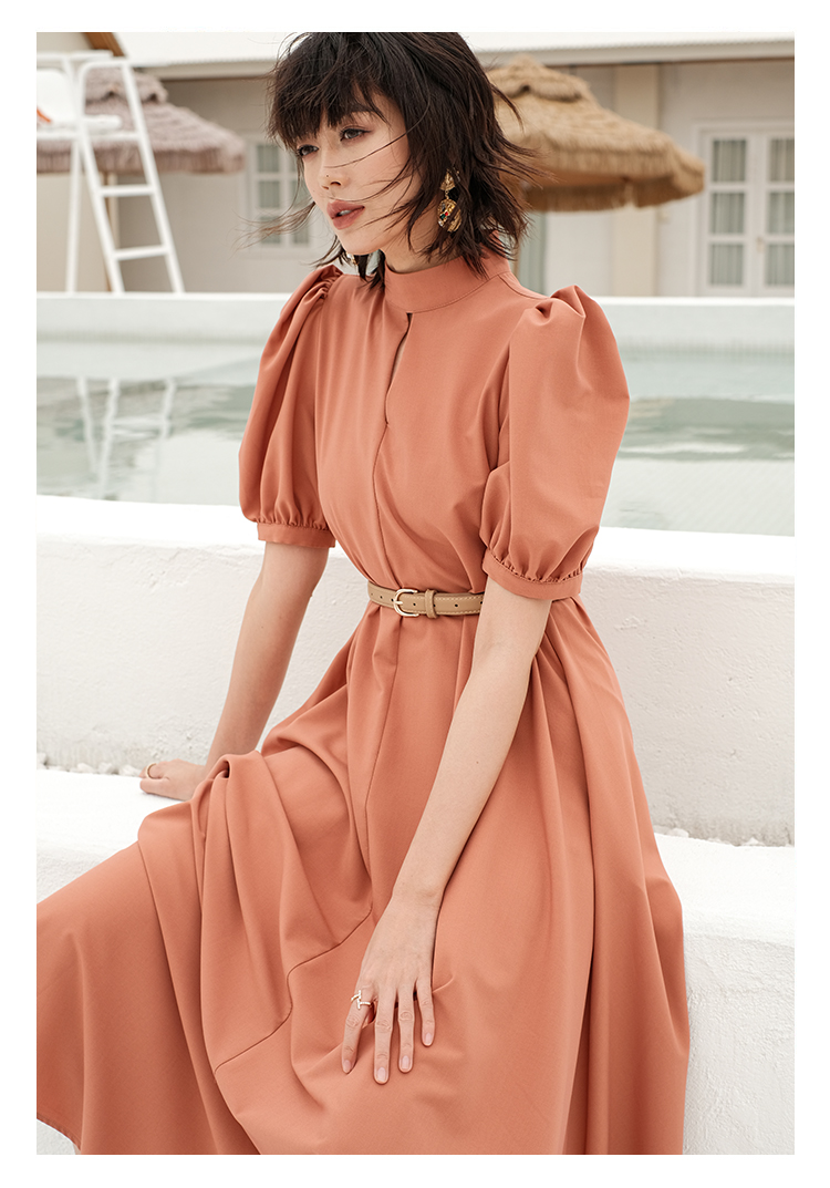 High neck Puff sleeves Belted waist Smooth woven fabric Lightweight feel
