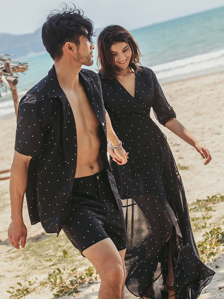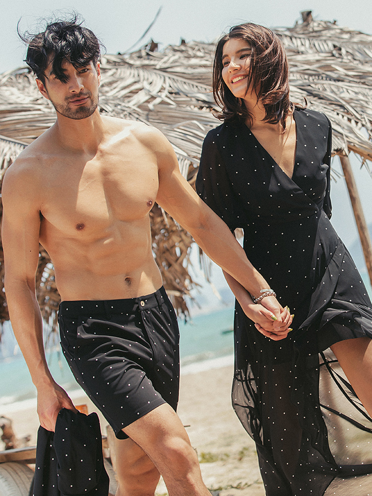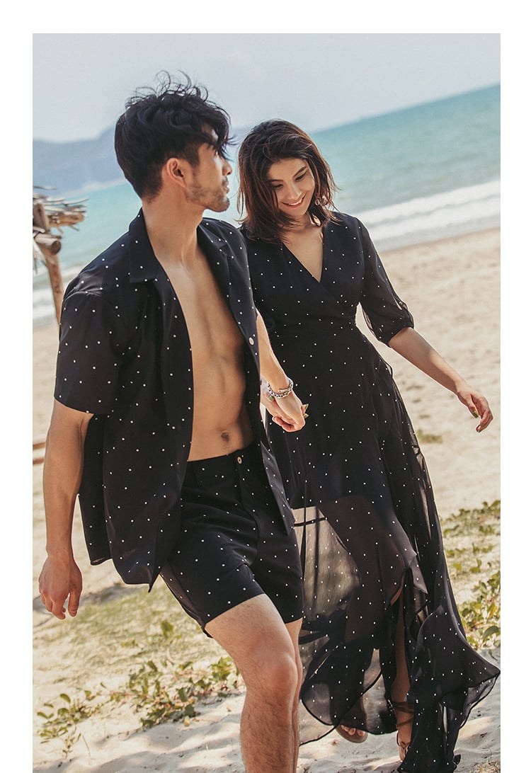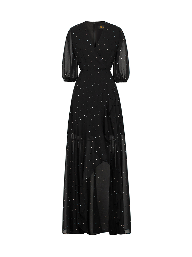 VERRAGE WRAP MAXI CHIFFON DRESS IN BLACK SPOT PRINT