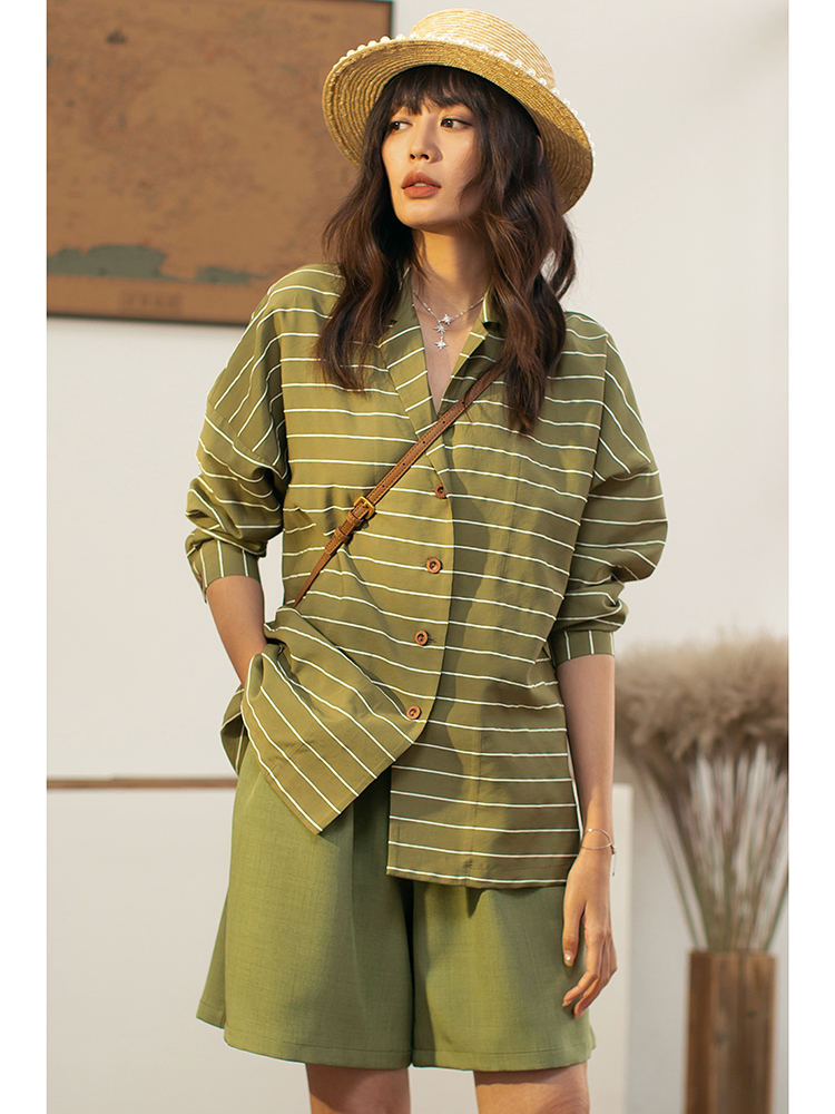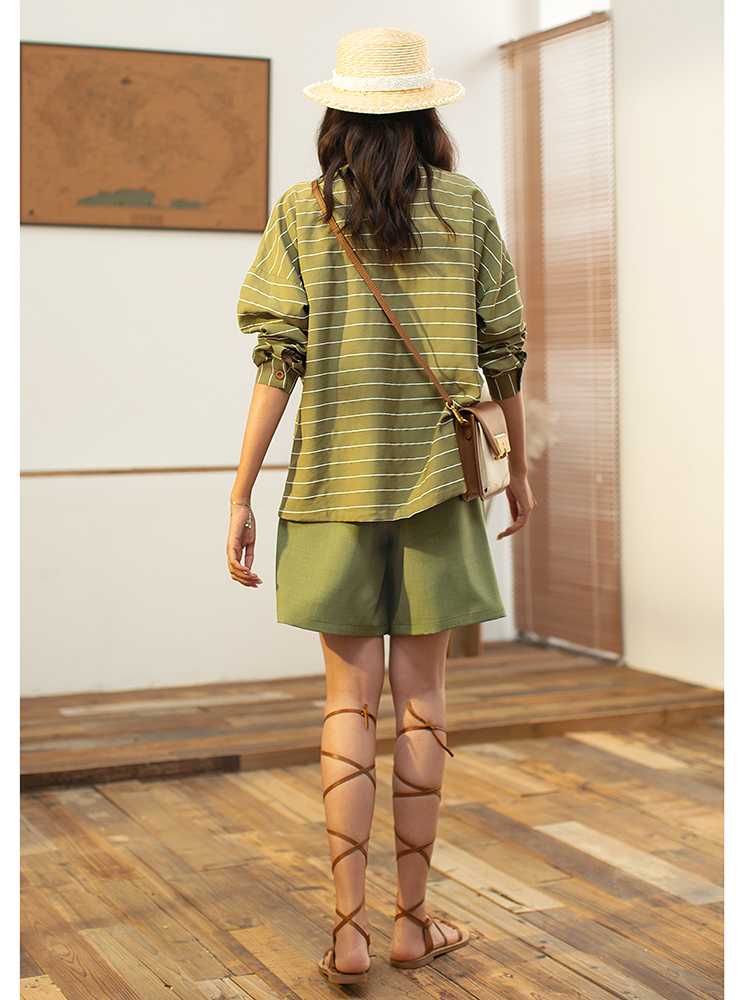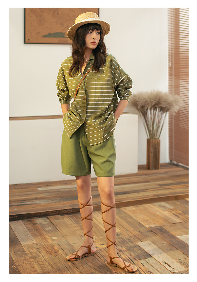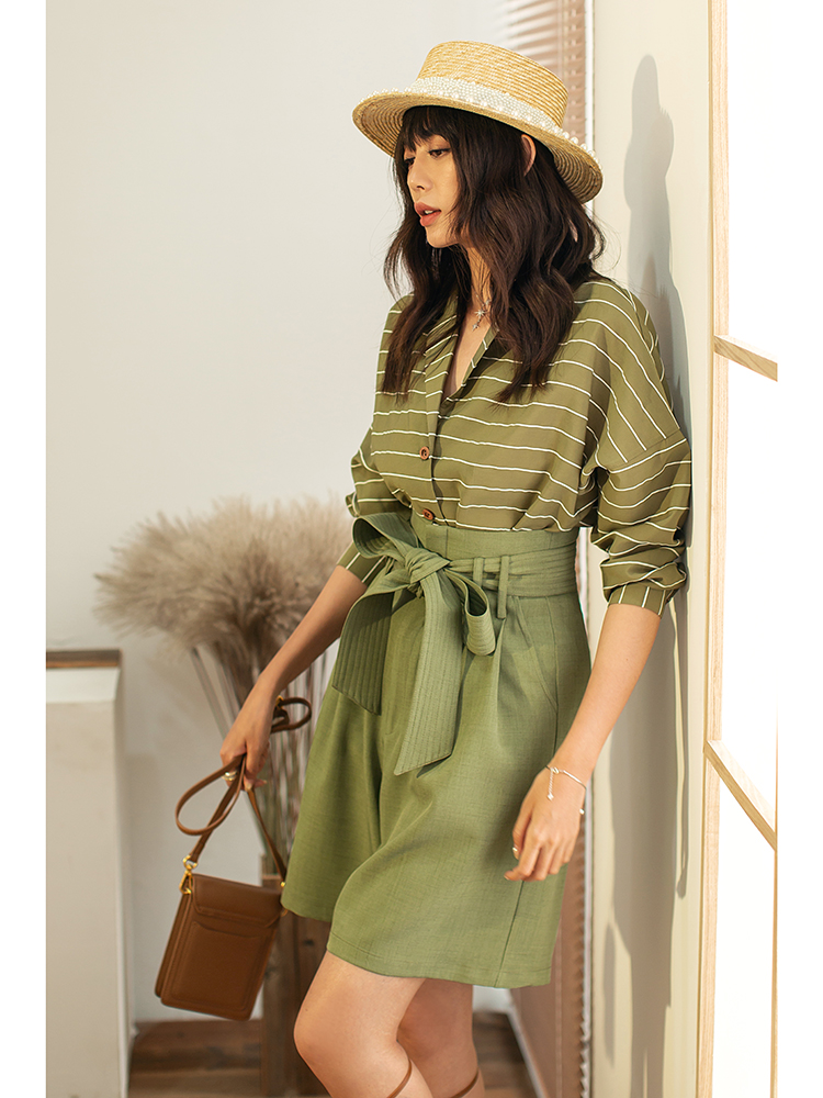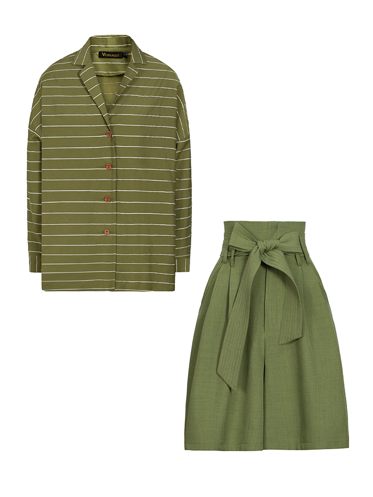 VERRAGE RELAXED FIT HORIZONTAL STRIPE SHIRT AND TIE FRONT WIDE LEG SHORTS