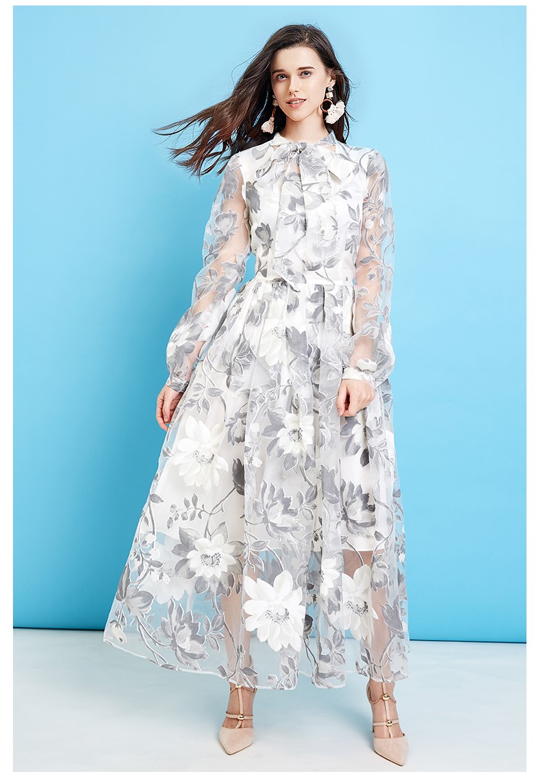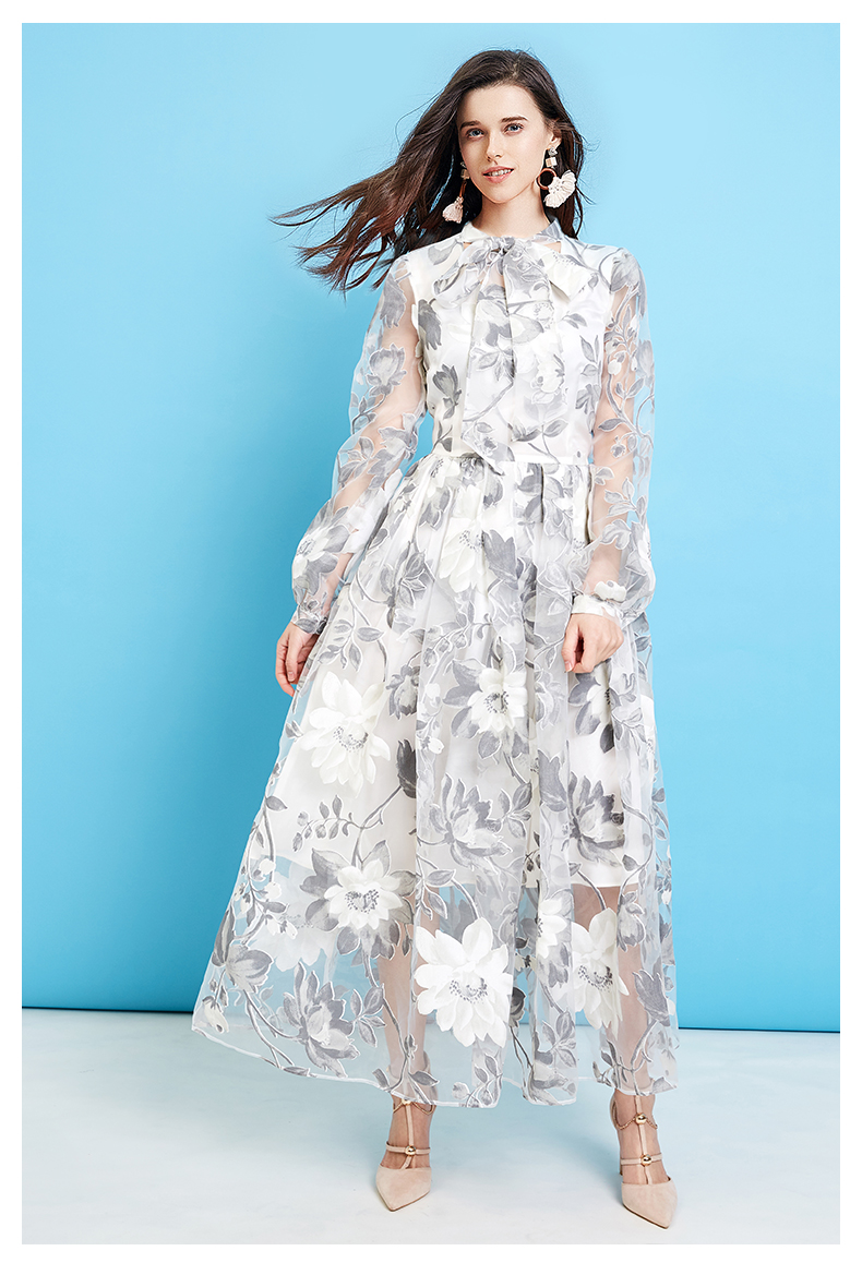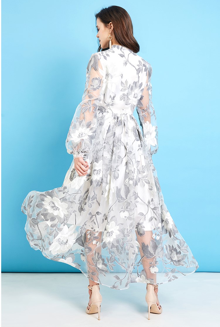 ARTKA DESIGN FLORAL EMBROIDERY MAXI DRESS WITH TIE NECK IN ASH GREY