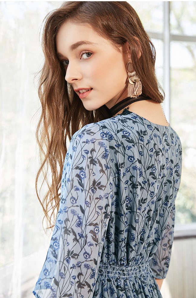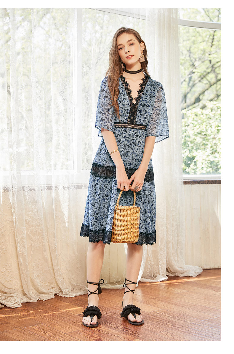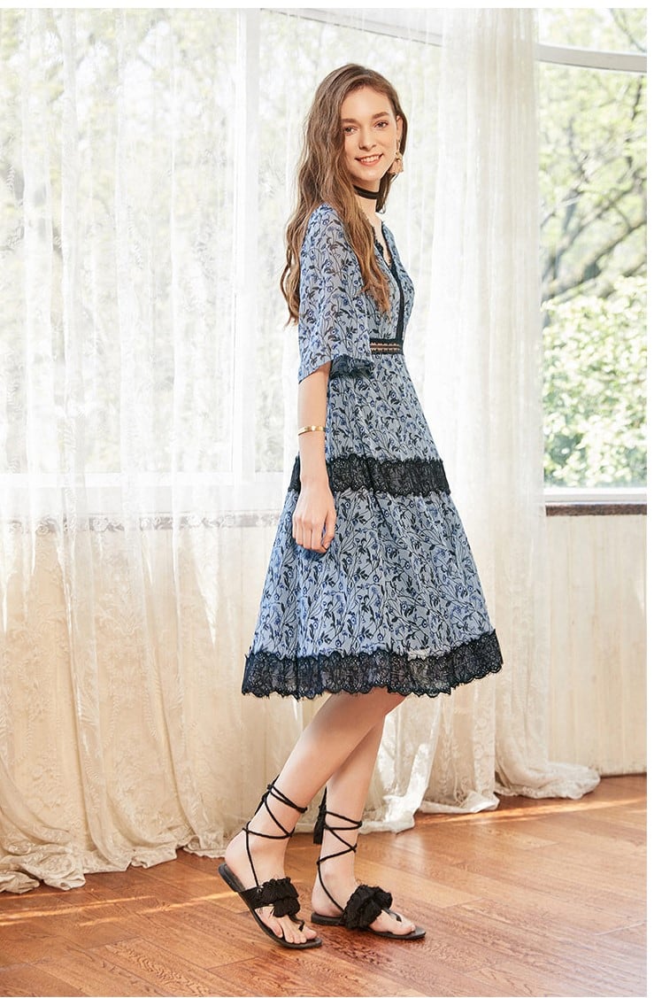 ARTKA LACE INSERT SHIRRED WAIST DRESS IN BLUE FLORAL