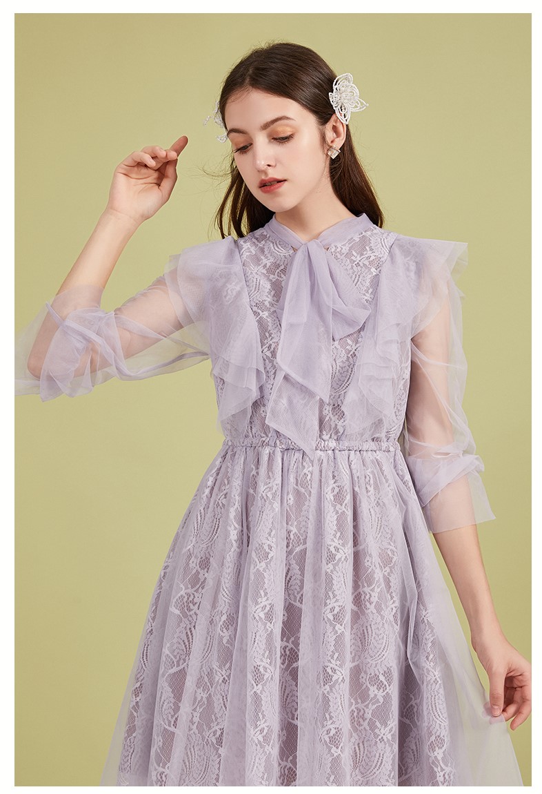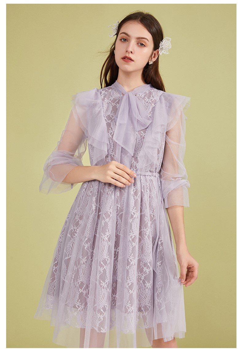 ARTKA TIE NECK LACE DRESS IN PURPLE MESH