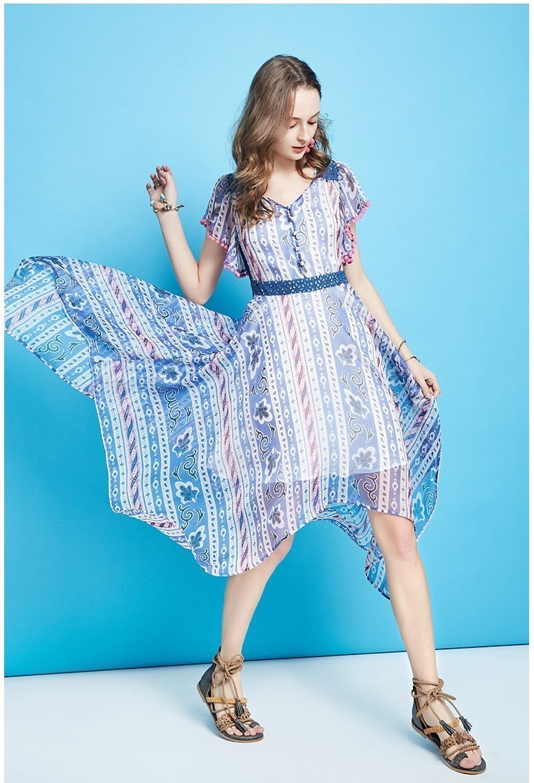 Scarf print Asymmetric hem Embroidery waist detail Tassel short sleeve