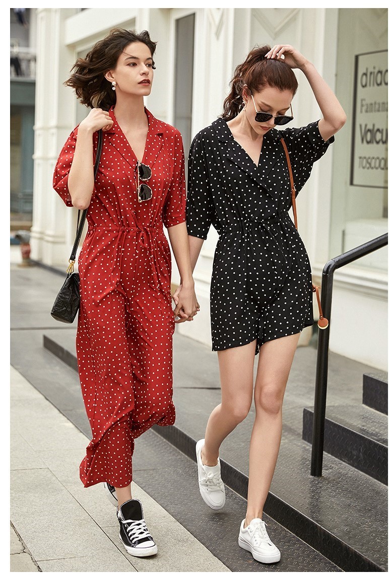 Button placket Short sleeves Tie waist Side pockets Polka dot print