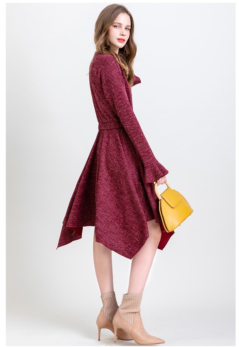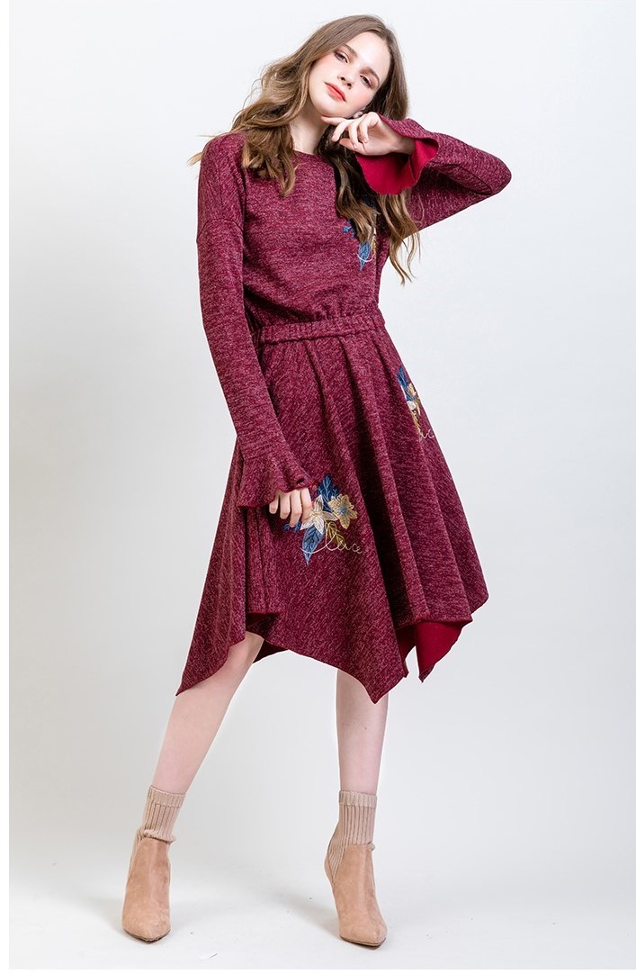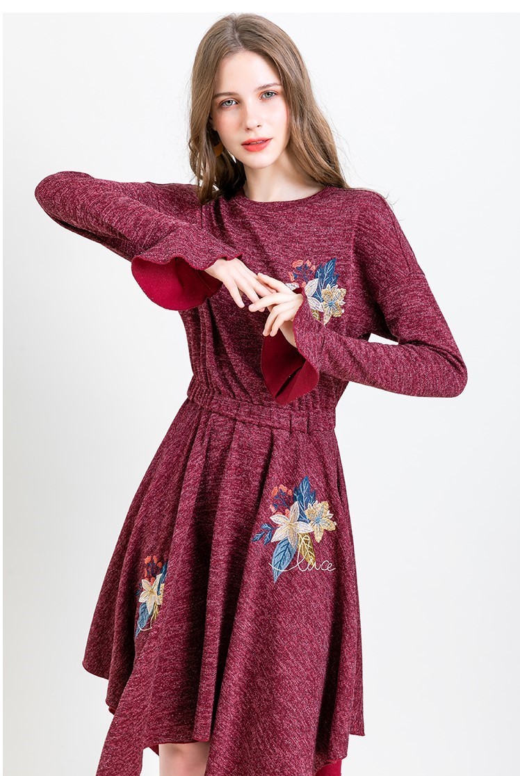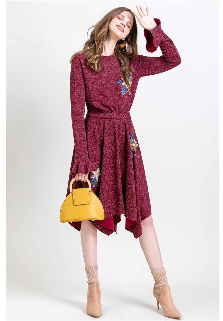 ARTKA LONG SLEEVE EMBROIDERY ASYMMETRIC HEM DRESS