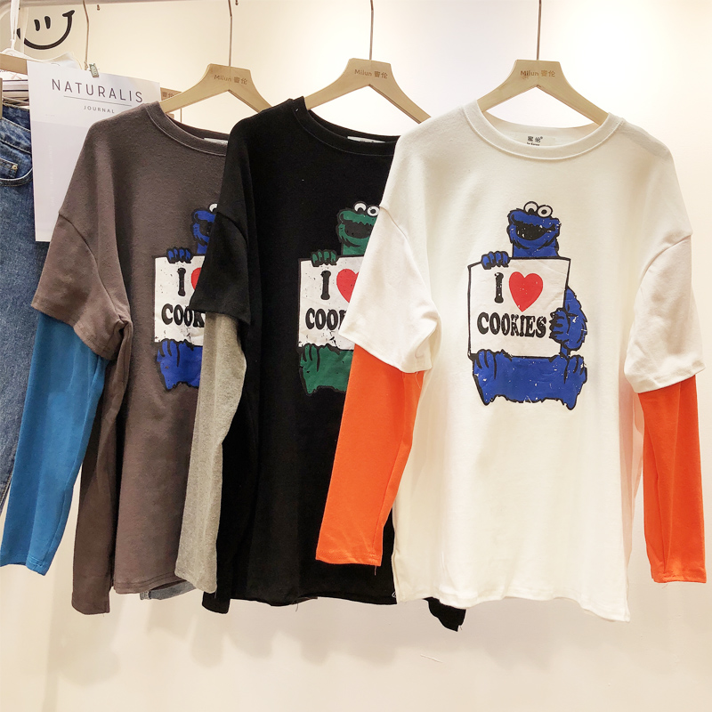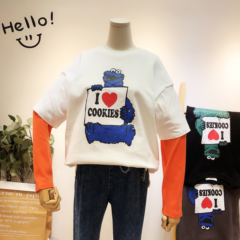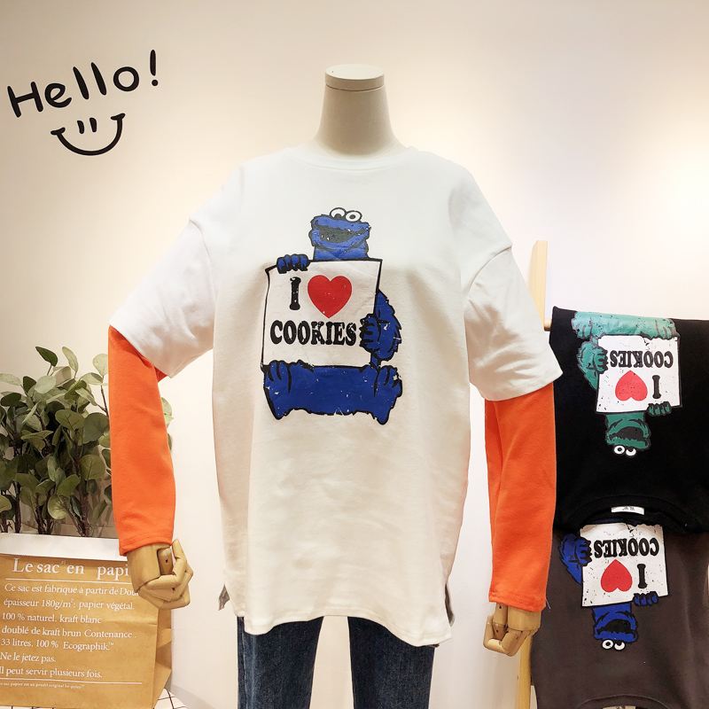 Contrast sleeve Crew neck Print design Double-layer sleeves Relaxed fit