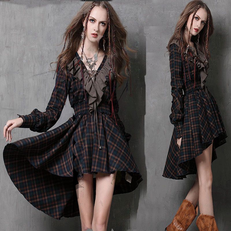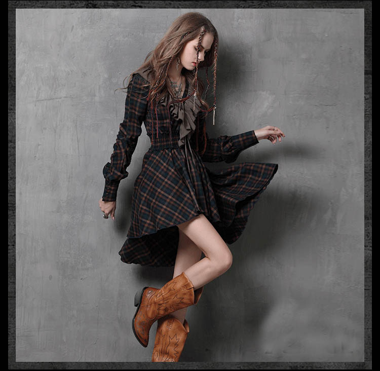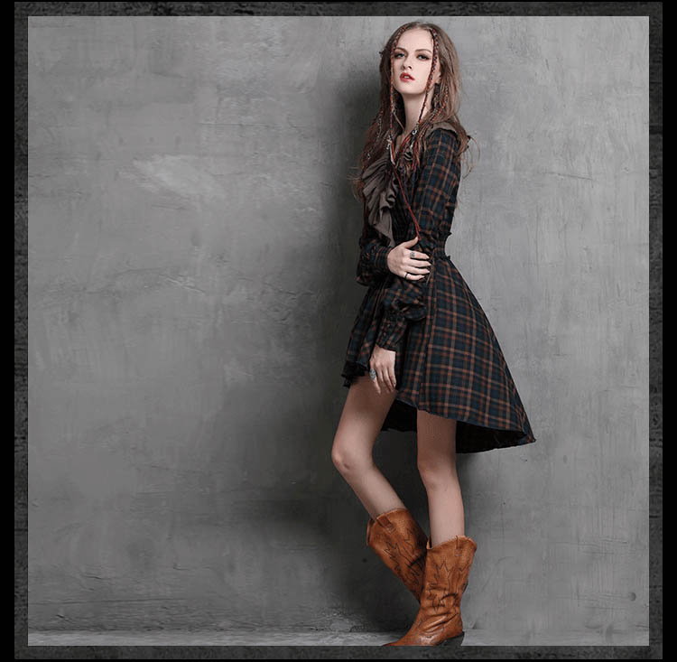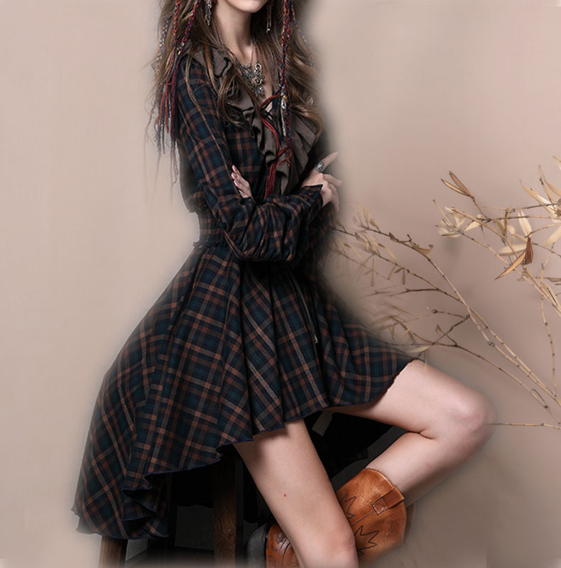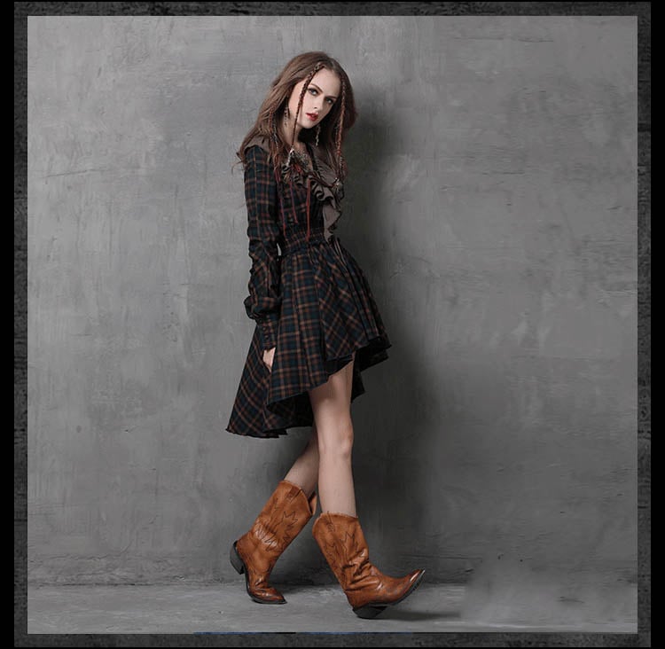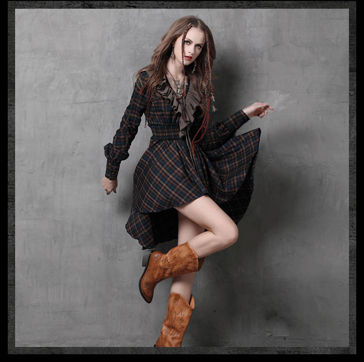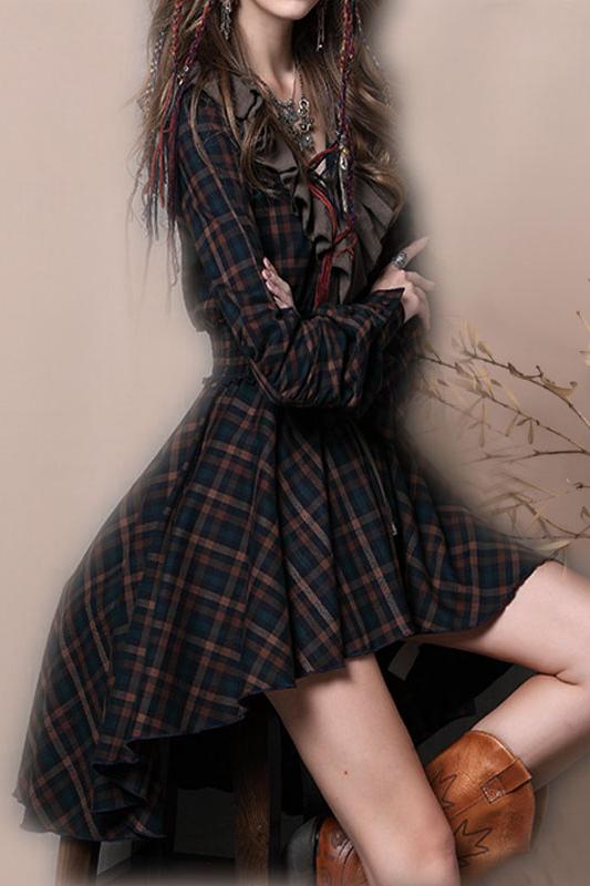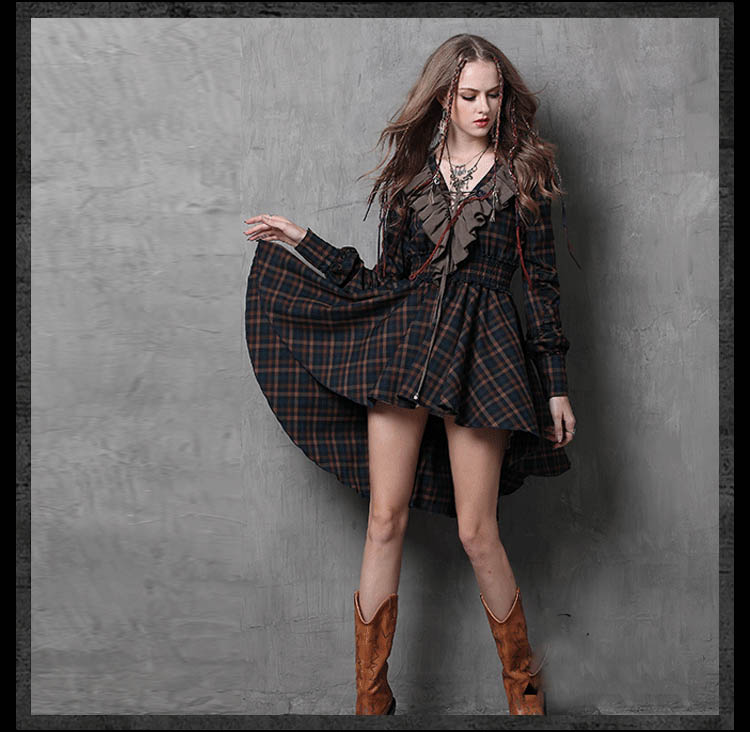 ARTKA KEER PLAID RUFFLED V NECK MID LENGTH DRESS IN BROWN