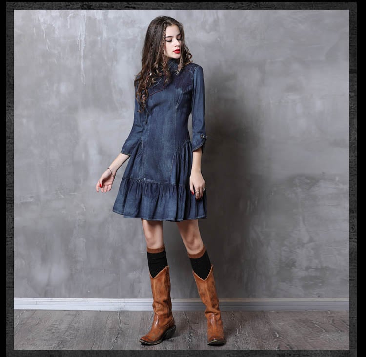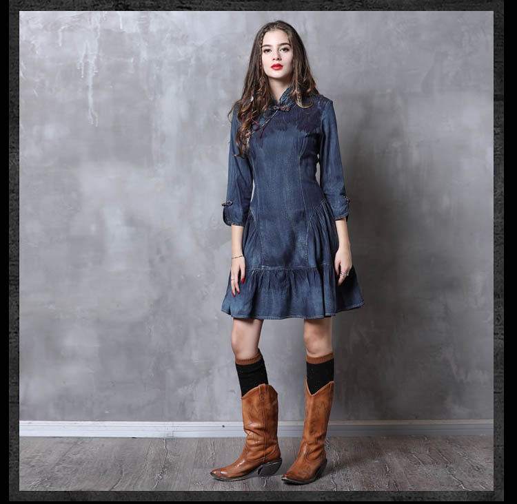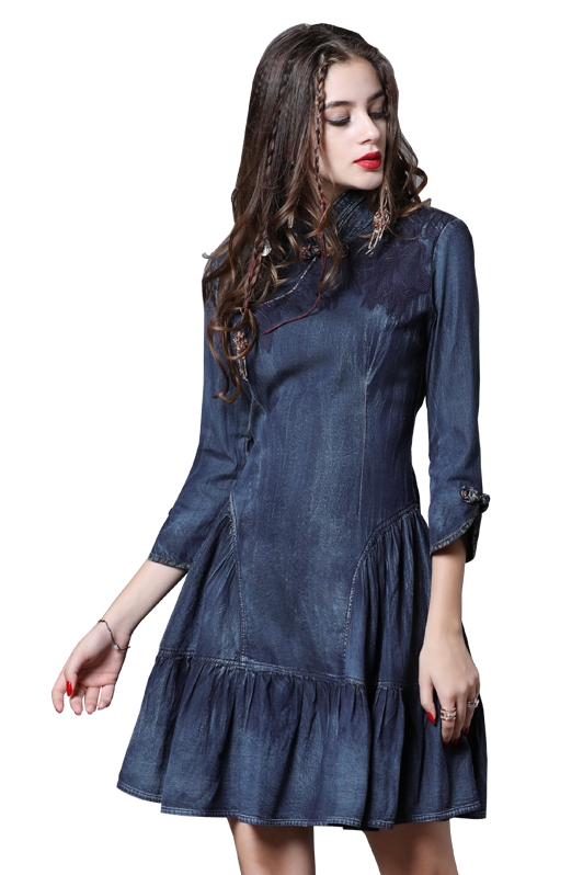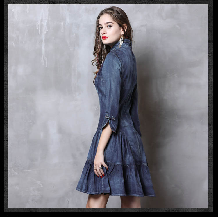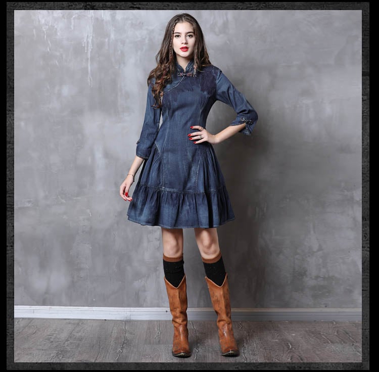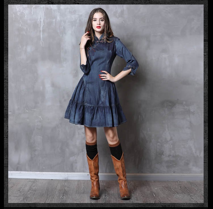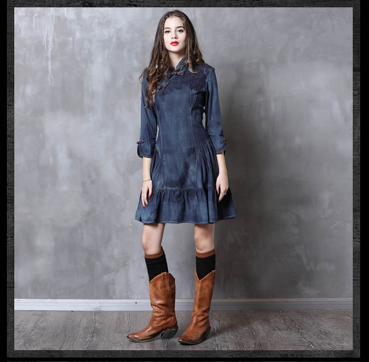 ARTKA KEER SHERILA CHEONGSAM HIGH COLLAR RUFFLED DENIM JEAN DRESS