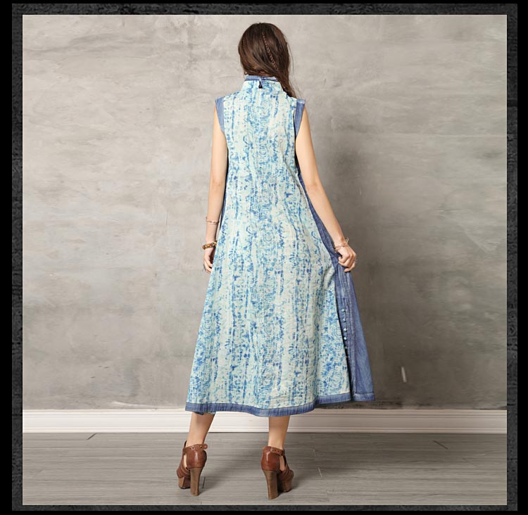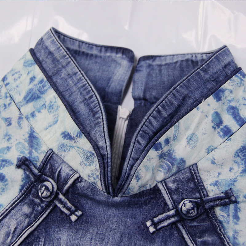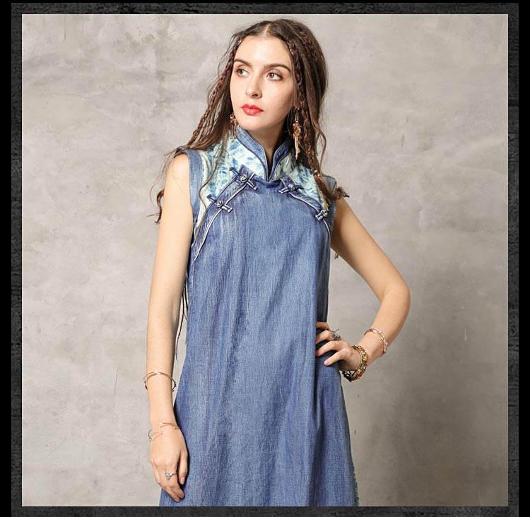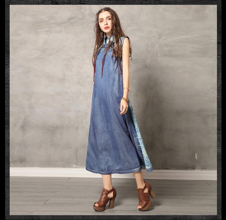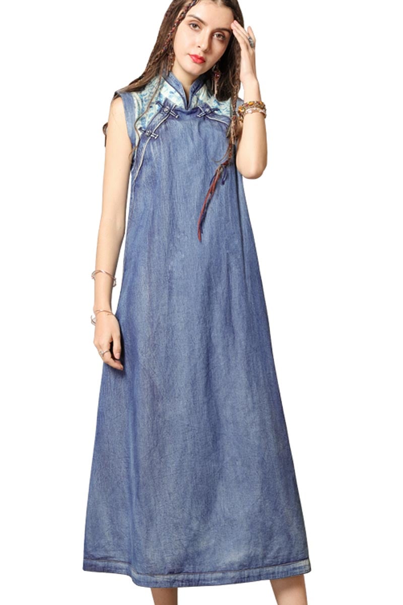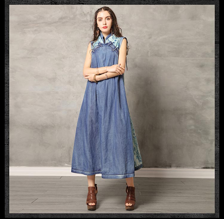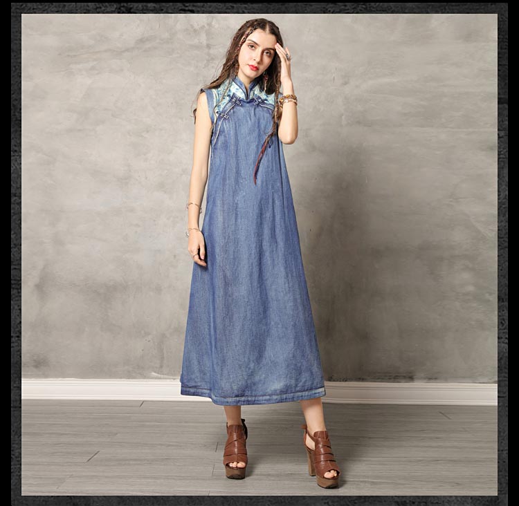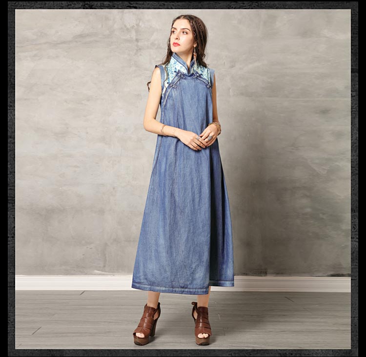 ARTKA KEER SHERILA ETHNIC STYLE CHEONGSAM DENIM JEAN MAXI DRESS