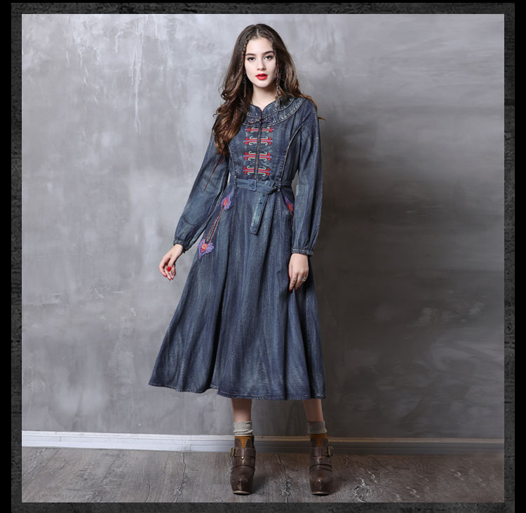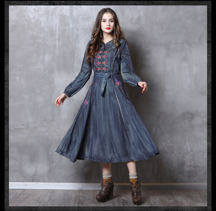 ARTKA VEIZA KEER ETHNIC RETRO STYLE MAXI DENIM JEAN DRESS IN NAVY