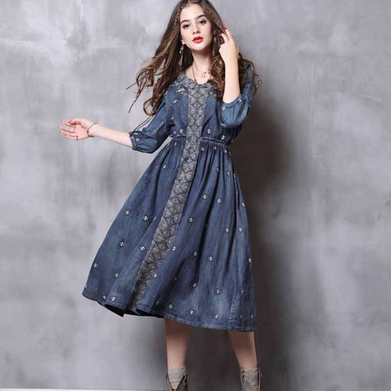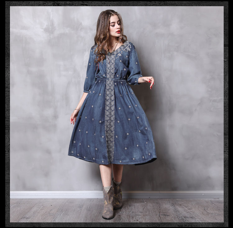 ARTKA KEER URBAN FRENCH STYLE V NECK DENIM JEAN MID DRESS